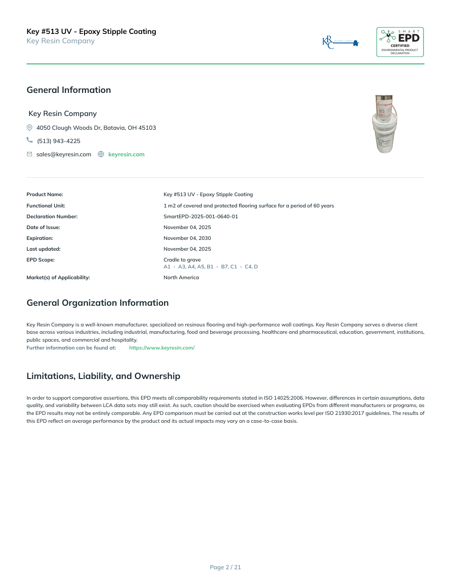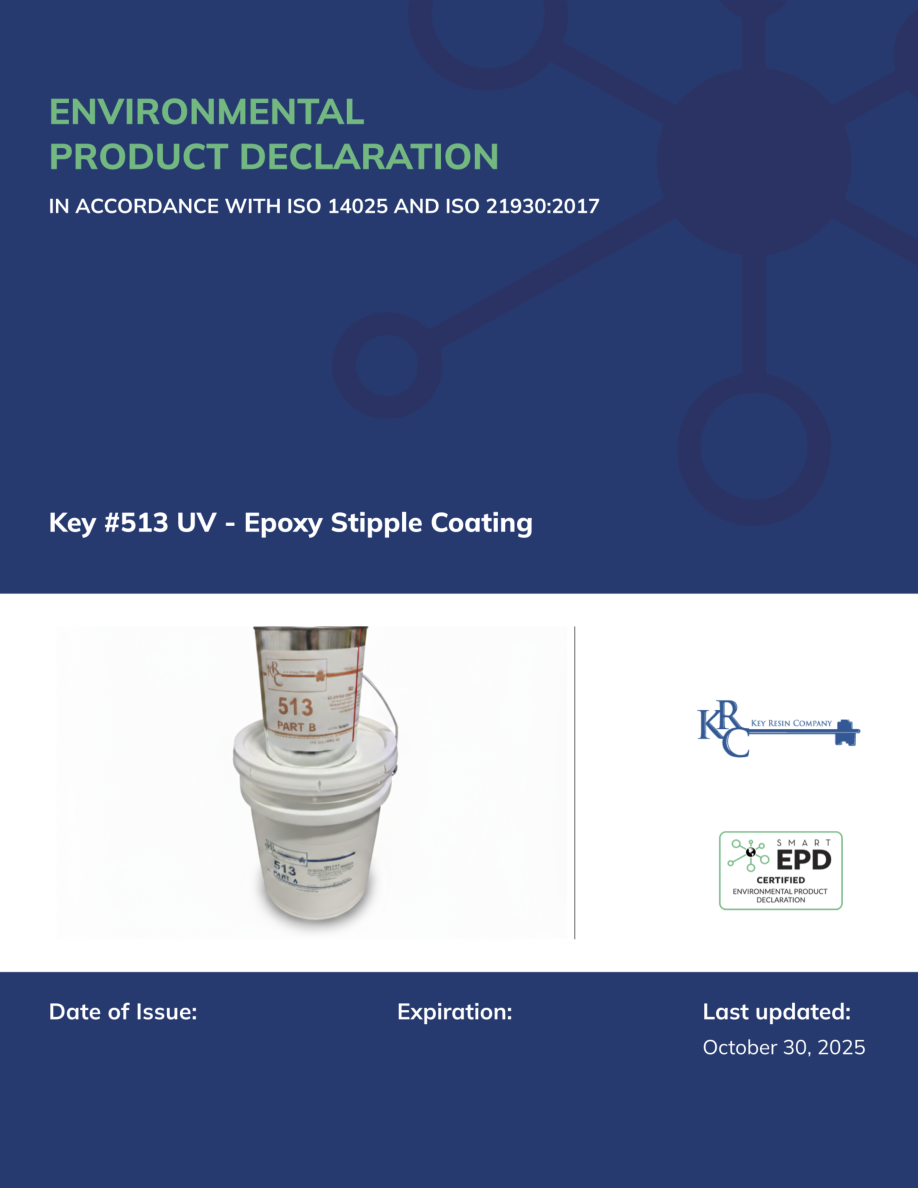 Key #513 UV - Epoxy Stipple CoatingKey Resin CompanyGeneral Information Key Resin Company 4050 Clough Woods Dr, Batavia, OH 45103(513) 943-4225sales@keyresin.comkeyresin.comProduct Name:Key #513 UV - Epoxy Stipple CoatingFunctional Unit:1 m2 of covered and protected flooring surface for a period of 60 yearsDeclaration Number:SmartEPD-2025-001-0640-01Date of Issue:November 04, 2025Expiration:November 04, 2030Last updated:November 04, 2025EPD Scope:Cradle to graveA1 - A3, A4, A5, B1 - B7, C1 - C4, D Market(s) of Applicability:North AmericaGeneral Organization InformationKey Resin Company is a well-known manufacturer, specialized on resinous flooring and high-performance wall coatings. Key Resin Company serves a diverse client base across various industries, including industrial, manufacturing, food and beverage processing, healthcare and pharmaceutical, education, government, institutions, public spaces, and commercial and hospitality.Further information can be found at:https://www.keyresin.com/Limitations, Liability, and OwnershipIn order to support comparative assertions, this EPD meets all comparability requirements stated in ISO 14025:2006. However, differences in certain assumptions, data quality, and variability between LCA data sets may still exist. As such, caution should be exercised when evaluating EPDs from different manufacturers or programs, as the EPD results may not be entirely comparable. Any EPD comparison must be carried out at the construction works level per ISO 21930:2017 guidelines. The results of this EPD reflect an average performance by the product and its actual impacts may vary on a case-to-case basis.Page 2 / 21