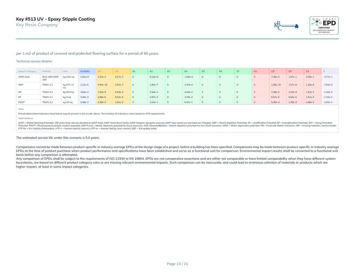 Key #513 UV - Epoxy Stipple CoatingKey Resin Companyper 1 m2 of product of covered and protected flooring surface for a period of 60 years.Technical service lifetimeImpact CategoryMethodUnitA1A2A3A4A5B1B2B3B4B5B6B7C1C2C3C4DGWP-totalIPCC AR5 GWP 100kg CO2-eq1.02e+03.23e-29.27e-206.14e+001.26e+100007.45e-31.57e-14.39e-1-3.77e-1ODPTRACI 2.1kg CFC-11 eq1.31e-55.55e-102.62e-701.85e-701.47e-400001.28e-101.07e-91.20e-8-7.63e-9APTRACI 2.1kg SO2 eq3.84e-31.03e-49.43e-502.34e-204.44e-200002.38e-51.03e-41.52e-3-1.26e-3EPTRACI 2.1kg N eq3.30e-32.85e-58.32e-502.87e-203.76e-200006.57e-66.63e-51.51e-3-1.15e-3POCPTRACI 2.1kg O3 eq5.48e-22.36e-31.61e-303.24e-106.47e-100005.45e-41.35e-32.46e-2-2.02e-2Note:Not all abbreviated indicators listed below may be present in the results above. The inclusion of indicators varies based on PCR requirements.Abbreviations:GWP = Global Warming Potential, 100 years (may also be denoted as GWP-total, GWP-fossil (fossil fuels), GWP-biogenic (biogenic sources), GWP-luluc (land use and land use change)), ODP = Ozone Depletion Potential, AP = Acidification Potential, EP = Eutrophication Potential, SFP = Smog Formation Potential, POCP = Photochemical oxidant creation potential, ADP-Fossil = Abiotic depletion potential for fossil resources, ADP-Minerals&Metals = Abiotic depletion potential for non-fossil resources, WDP = Water deprivation potential, PM = Particular Matter Emissions, IRP = Ionizing radiation, human health, ETP-fw = Eco-toxicity (freshwater), HTP-c = Human toxicity (cancer), HTP-nc = Human toxicity (non-cancer), SQP = Soil quality index.The estimated service life under this scenario is 5.0 years.Comparisons cannot be made between product-specific or industry average EPDs at the design stage of a project, before a building has been specified. Comparisons may be made between product-specific or industry average EPDs at the time of product purchase when product performance and specifications have been established and serve as a functional unit for comparison. Environmental impact results shall be converted to a functional unit basis before any comparison is attempted.Any comparison of EPDs shall be subject to the requirements of ISO 21930 or EN 15804. EPDs are not comparative assertions and are either not comparable or have limited comparability when they have different system boundaries, are based on different product category rules or are missing relevant environmental impacts. Such comparison can be inaccurate, and could lead to erroneous selection of materials or products which are higher-impact, at least in some impact categories.Page 13 / 21