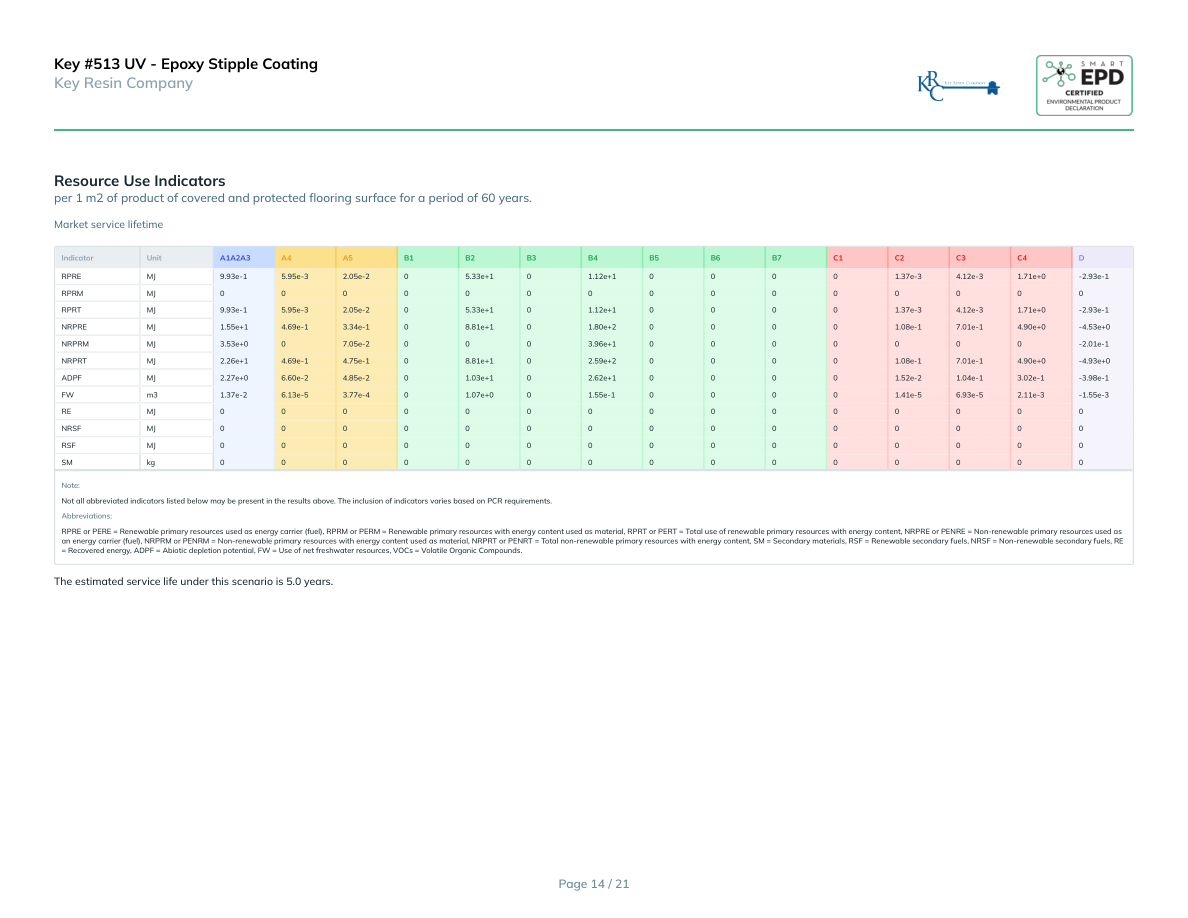 Key #513 UV - Epoxy Stipple CoatingKey Resin CompanyResource Use Indicatorsper 1 m2 of product of covered and protected flooring surface for a period of 60 years.Market service lifetimeIndicatorUnitA1A2A3A4A5B1B2B3B4B5B6B7C1C2C3C4DRPREMJ9.93e-15.95e-32.05e-205.33e+101.12e+100001.37e-34.12e-31.71e+0-2.93e-1RPRMMJ000000000000000RPRTMJ9.93e-15.95e-32.05e-205.33e+101.12e+100001.37e-34.12e-31.71e+0-2.93e-1NRPREMJ1.55e+14.69e-13.34e-108.81e+101.80e+200001.08e-17.01e-14.90e+0-4.53e+0NRPRMMJ3.53e+007.05e-20003.96e+10000000-2.01e-1NRPRTMJ2.26e+14.69e-14.75e-108.81e+102.59e+200001.08e-17.01e-14.90e+0-4.93e+0ADPFMJ2.27e+06.60e-24.85e-201.03e+102.62e+100001.52e-21.04e-13.02e-1-3.98e-1FWm31.37e-26.13e-53.77e-401.07e+001.55e-100001.41e-56.93e-52.11e-3-1.55e-3REMJ000000000000000NRSFMJ000000000000000RSFMJ000000000000000SMkg000000000000000Note:Not all abbreviated indicators listed below may be present in the results above. The inclusion of indicators varies based on PCR requirements.Abbreviations:RPRE or PERE = Renewable primary resources used as energy carrier (fuel), RPRM or PERM = Renewable primary resources with energy content used as material, RPRT or PERT = Total use of renewable primary resources with energy content, NRPRE or PENRE = Non-renewable primary resources used as an energy carrier (fuel), NRPRM or PENRM = Non-renewable primary resources with energy content used as material, NRPRT or PENRT = Total non-renewable primary resources with energy content, SM = Secondary materials, RSF = Renewable secondary fuels, NRSF = Non-renewable secondary fuels, RE = Recovered energy, ADPF = Abiotic depletion potential, FW = Use of net freshwater resources, VOCs = Volatile Organic Compounds.The estimated service life under this scenario is 5.0 years.Page 14 / 21