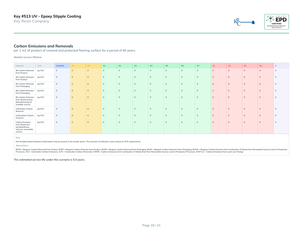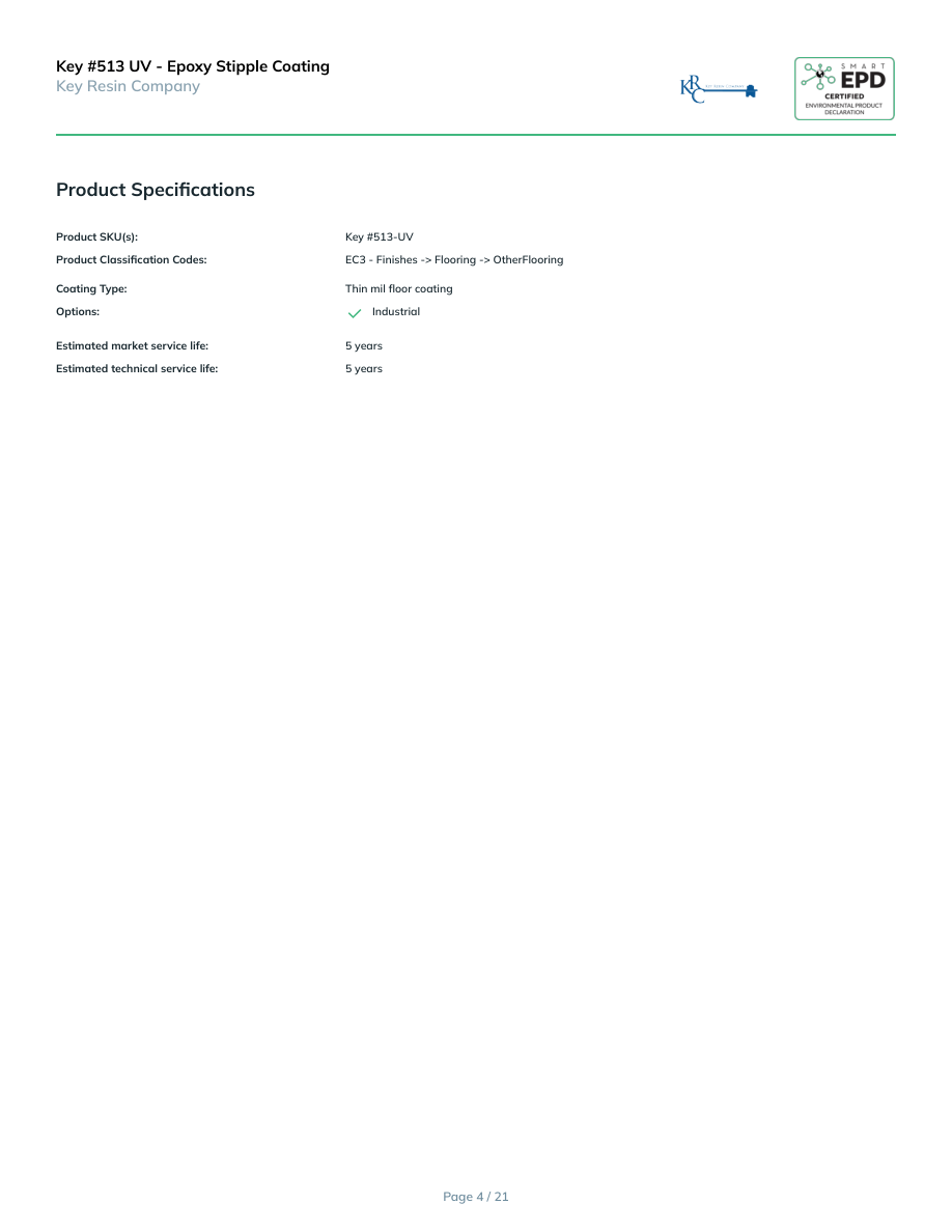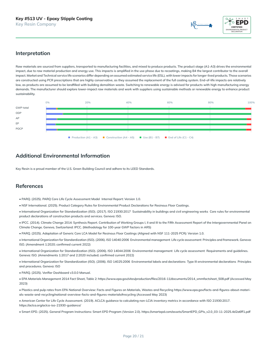 Key #513 UV - Epoxy Stipple CoatingKey Resin CompanyInterpretationRaw materials are sourced from suppliers, transported to manufacturing facilities, and mixed to produce products. The product stage (A1-A3) drives the environmental impact, due to raw material production and energy use. This impacts is amplified in the use phase due to recoatings, making B4 the largest contributor to the overall impact. Market and Technical service life scenarios differ depending on assumed estimated service life (ESL), with lower impacts for longer-lived products. Those scenarios are constructed using PCR prescriptions that are highly conservative, as they assumed the replacement of the full coating system. End-of-life impacts are relatively low, as products are assumed to be landfilled with building demolition waste. Switching to renewable energy is advised for products with high manufacturing energy demands. The manufacturer should explore lower-impact raw materials and work with suppliers using sustainable methods or renewable energy to enhance product sustainability.0%20%40%60%80%100%GWP-totalODPAPEPPOCPProduction (A1 - A3)Construction (A4 - A5)Use (B1 - B7)End of Life (C1 - C4)Additional Environmental InformationKey Resin is a proud member of the U.S. Green Building Council and adhere to its LEED Standards.References• PARQ. (2025). PARQ Core Life Cycle Assessment Model Internal Report: Version 1.0.• NSF International. (2025). Product Category Rules for Environmental Product Declarations for Resinous Floor Coatings.• International Organization for Standardization (ISO). (2017). ISO 21930:2017 Sustainability in buildings and civil engineering works Core rules for environmental product declarations of construction products and services. Geneva: ISO.• IPCC. (2014). Climate Change 2014: Synthesis Report. Contribution of Working Groups I, II and III to the Fifth Assessment Report of the Intergovernmental Panel on Climate Change. Geneva, Switzerland: IPCC. (Methodology for 100-year GWP factors in AR5)• PARQ. (2025). Adaptation of Generic Core LCA Model for Resinous Floor Coatings (Aligned with NSF 111-2025 PCR): Version 1.0.• International Organization for Standardization (ISO). (2006). ISO 14040:2006 Environmental management Life cycle assessment Principles and framework. Geneva: ISO. (Amendment 1:2020; confirmed current 2022)• International Organization for Standardization (ISO). (2006). ISO 14044:2006 Environmental management Life cycle assessment Requirements and guidelines. Geneva: ISO. (Amendments 1:2017 and 2:2020 included; confirmed current 2022)• International Organization for Standardization (ISO). (2006). ISO 14025:2006 Environmental labels and declarations Type III environmental declarations Principles and procedures. Geneva: ISO• PARQ. (2025). Verifier Dashboard v3.0.0 Manual.• EPA Materials Management 2014 Fact Sheet, Table 2: https://www.epa.gov/sites/production/files/2016-11/documents/2014_smmfactsheet_508.pdf (Accessed May 2023)• Plastics and pulp rates from EPA National Overview: Facts and Figures on Materials, Wastes and Recycling https://www.epa.gov/facts-and-figures-about-materi-als-waste-and-recycling/national-overview-facts-and-figures-materials#recycling (Accessed May 2023)• American Center for Life Cycle Assessment. (2019). ACLCA guidance to calculating non-LCIA inventory metrics in accordance with ISO 21930:2017. https://aclca.org/aclca-iso-21930-guidance/• Smart EPD. (2025). General Program Instructions: Smart EPD Program (Version 2.0). https://smartepd.com/assets/SmartEPD_GPIs_v2.0_03-11-2025.4d2a6ff1.pdfPage 20 / 21