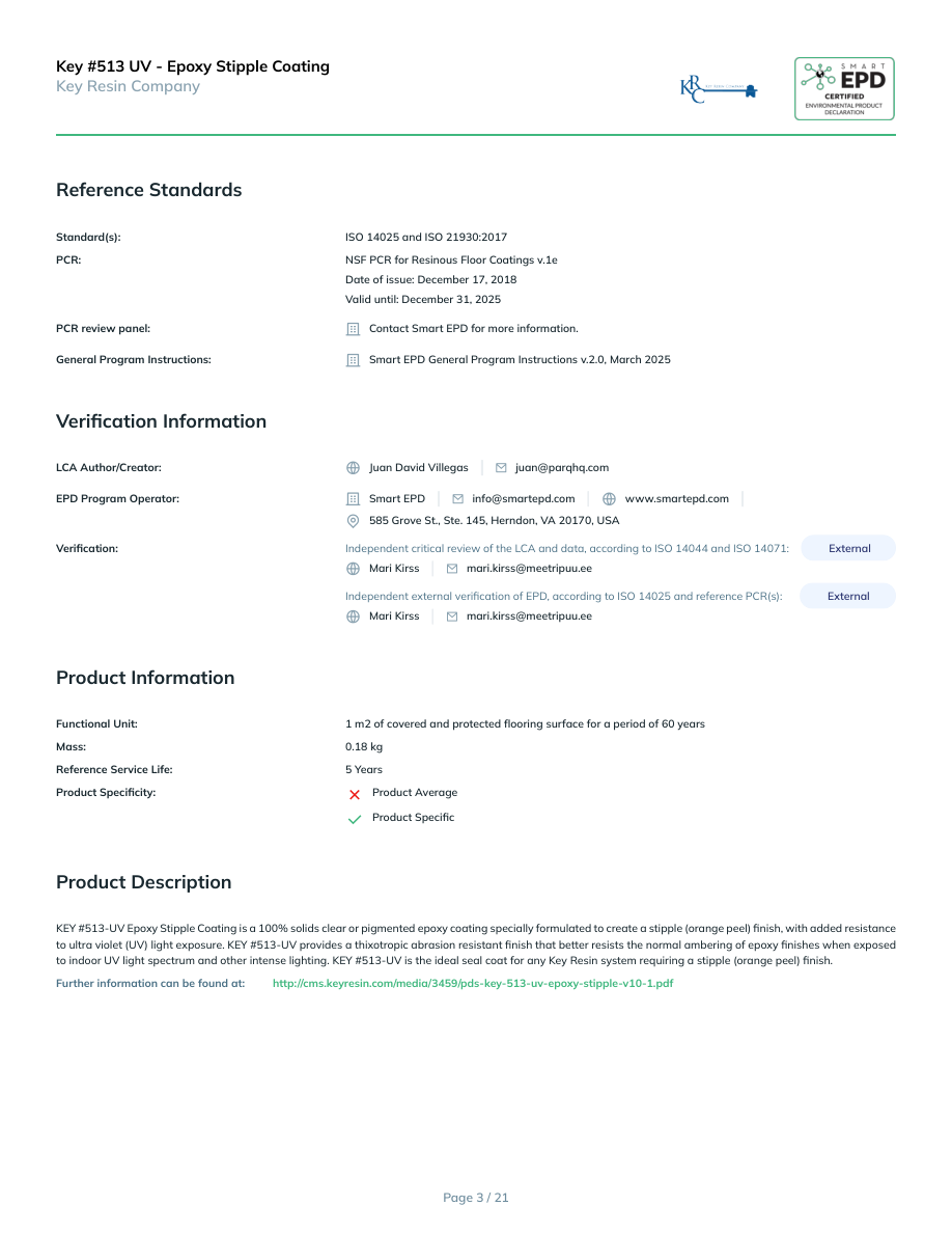Key #513 UV - Epoxy Stipple CoatingKey Resin CompanyReference StandardsStandard(s):ISO 14025 and ISO 21930:2017PCR:NSF PCR for Resinous Floor Coatings v.1eDate of issue: December 17, 2018Valid until: December 31, 2025PCR review panel:Contact Smart EPD for more information.General Program Instructions:Smart EPD General Program Instructions v.2.0, March 2025Verification InformationLCA Author/Creator:Juan David Villegasjuan@parqhq.comEPD Program Operator:Smart EPDinfo@smartepd.comwww.smartepd.com585 Grove St., Ste. 145, Herndon, VA 20170, USAVerification:Independent critical review of the LCA and data, according to ISO 14044 and ISO 14071:ExternalMari Kirssmari.kirss@meetripuu.eeIndependent external verification of EPD, according to ISO 14025 and reference PCR(s):ExternalMari Kirssmari.kirss@meetripuu.eeProduct InformationFunctional Unit:1 m2 of covered and protected flooring surface for a period of 60 yearsMass:0.18 kgReference Service Life:5 YearsProduct Specificity:Product AverageProduct SpecificProduct DescriptionKEY #513-UV Epoxy Stipple Coating is a 100% solids clear or pigmented epoxy coating specially formulated to create a stipple (orange peel) finish, with added resistance to ultra violet (UV) light exposure. KEY #513-UV provides a thixotropic abrasion resistant finish that better resists the normal ambering of epoxy finishes when exposed to indoor UV light spectrum and other intense lighting. KEY #513-UV is the ideal seal coat for any Key Resin system requiring a stipple (orange peel) finish.Further information can be found at:http://cms.keyresin.com/media/3459/pds-key-513-uv-epoxy-stipple-v10-1.pdfPage 3 / 21