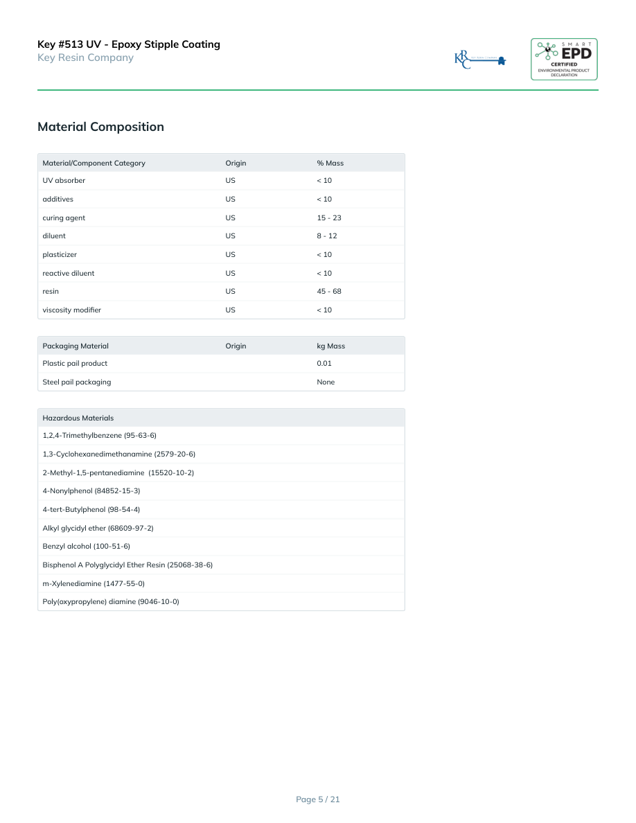 Key #513 UV - Epoxy Stipple CoatingKey Resin CompanyMaterial CompositionMaterial/Component CategoryOrigin% MassUV absorberUS< 10additivesUS< 10curing agentUS15 - 23diluentUS8 - 12plasticizerUS< 10reactive diluentUS< 10resinUS45 - 68viscosity modifierUS< 10Packaging MaterialOriginkg MassPlastic pail product 0.01Steel pail packaging NoneHazardous Materials1,2,4-Trimethylbenzene (95-63-6)1,3-Cyclohexanedimethanamine (2579-20-6)2-Methyl-1,5-pentanediamine (15520-10-2)4-Nonylphenol (84852-15-3)4-tert-Butylphenol (98-54-4)Alkyl glycidyl ether (68609-97-2)Benzyl alcohol (100-51-6)Bisphenol A Polyglycidyl Ether Resin (25068-38-6)m-Xylenediamine (1477-55-0)Poly(oxypropylene) diamine (9046-10-0)Page 5 / 21