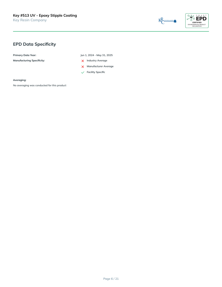 Key #513 UV - Epoxy Stipple CoatingKey Resin CompanyEPD Data SpecificityPrimary Data Year:Jun 1, 2024 - May 31, 2025Manufacturing Specificity:Industry AverageManufacturer AverageFacility SpecificAveraging:No averaging was conducted for this productPage 6 / 21