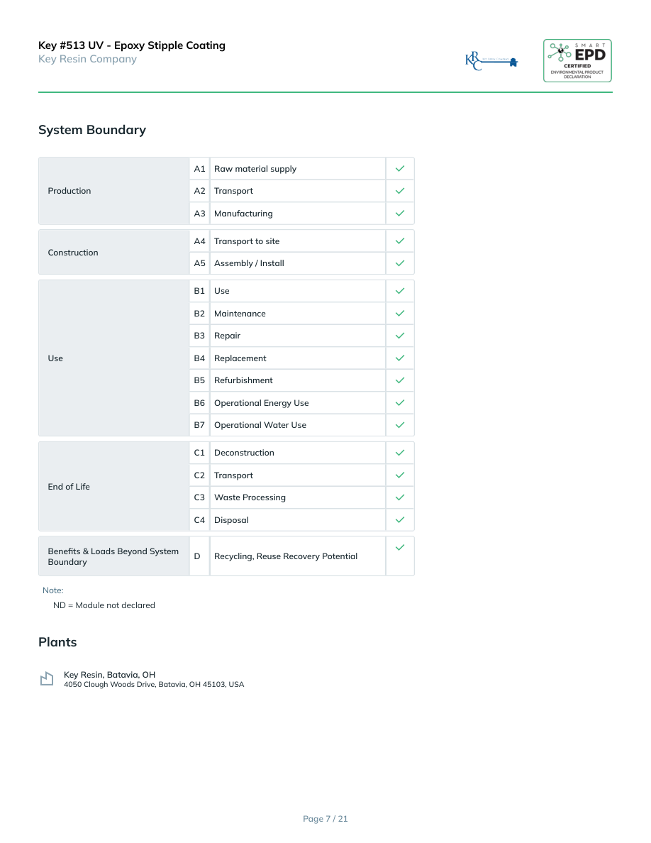 Key #513 UV - Epoxy Stipple CoatingKey Resin CompanySystem BoundaryProductionA1Raw material supplyA2TransportA3ManufacturingConstructionA4Transport to siteA5Assembly / InstallUseB1UseB2MaintenanceB3RepairB4ReplacementB5RefurbishmentB6Operational Energy UseB7Operational Water UseEnd of LifeC1DeconstructionC2TransportC3Waste ProcessingC4DisposalBenefits & Loads Beyond System BoundaryDRecycling, Reuse Recovery PotentialNote:ND = Module not declaredPlantsKey Resin, Batavia, OH4050 Clough Woods Drive, Batavia, OH 45103, USAPage 7 / 21