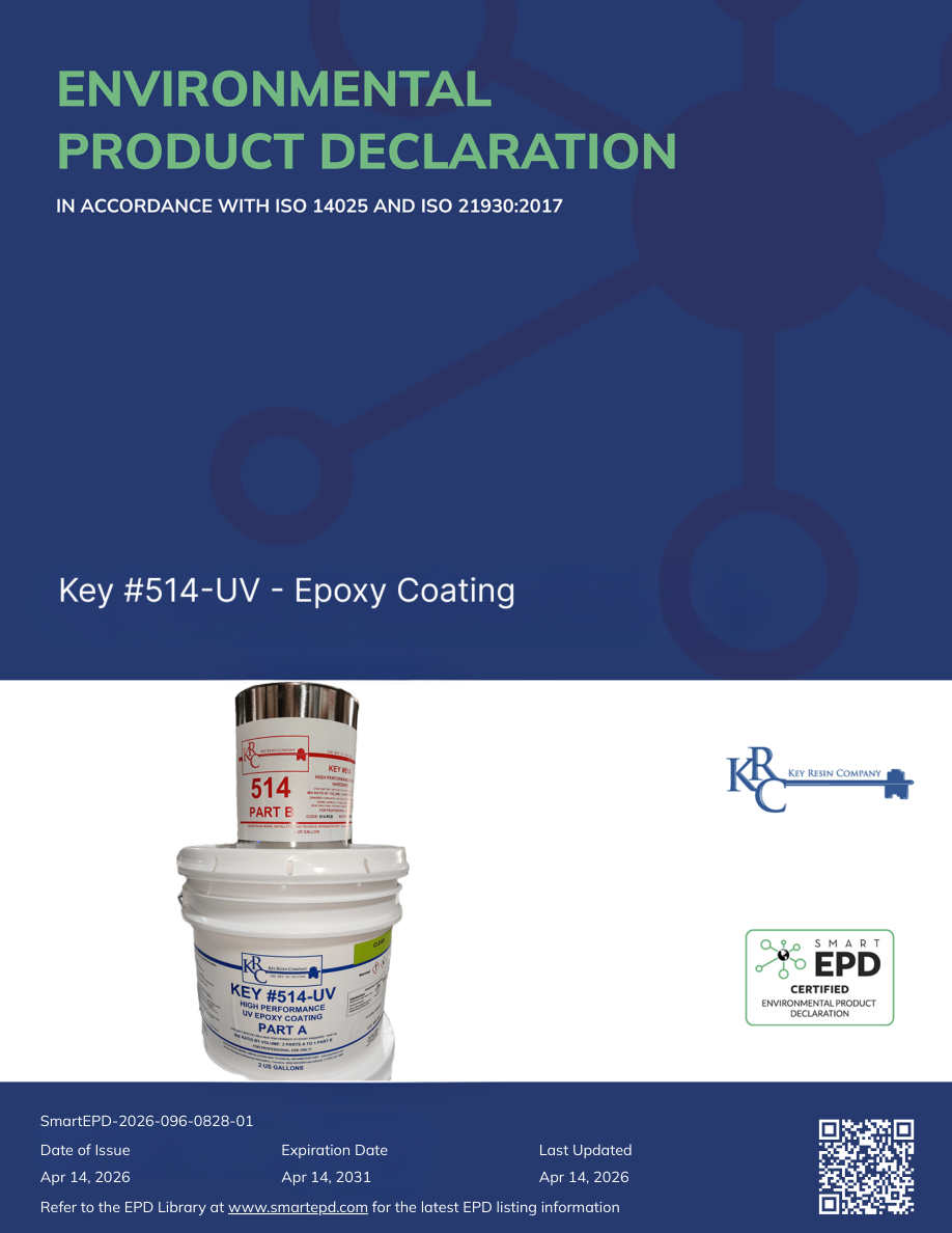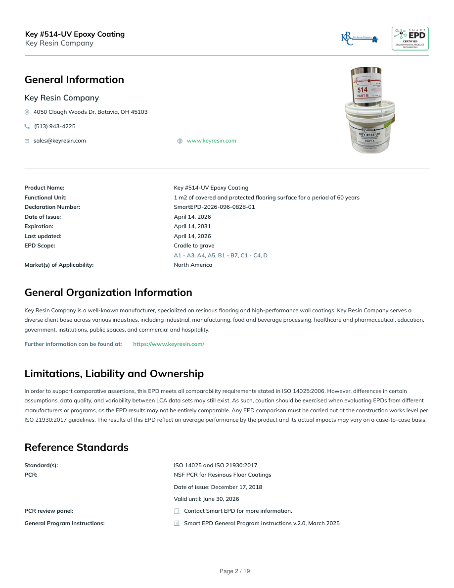 General InformationKey Resin Company4050 Clough Woods Dr, Batavia, OH 45103(513) 943-4225sales@keyresin.comwww.keyresin.comProduct Name:Key #514-UV Epoxy CoatingFunctional Unit:1 m2 of covered and protected flooring surface for a period of 60 yearsDeclaration Number:SmartEPD-2026-096-0828-01Date of Issue:April 14, 2026Expiration:April 14, 2031Last updated:April 14, 2026EPD Scope:Cradle to graveA1 - A3, A4, A5, B1 - B7, C1 - C4, DMarket(s) of Applicability:North AmericaGeneral Organization InformationKey Resin Company is a well-known manufacturer, specialized on resinous flooring and high-performance wall coatings. Key Resin Company serves adiverse client base across various industries, including industrial, manufacturing, food and beverage processing, healthcare and pharmaceutical, education,government, institutions, public spaces, and commercial and hospitality.Further information can be found at:https://www.keyresin.com/Limitations, Liability and OwnershipIn order to support comparative assertions, this EPD meets all comparability requirements stated in ISO 14025:2006. However, differences in certainassumptions, data quality, and variability between LCA data sets may still exist. As such, caution should be exercised when evaluating EPDs from differentmanufacturers or programs, as the EPD results may not be entirely comparable. Any EPD comparison must be carried out at the construction works level perISO 21930:2017 guidelines. The results of this EPD reflect an average performance by the product and its actual impacts may vary on a case-to-case basis.Reference StandardsStandard(s):ISO 14025 and ISO 21930:2017PCR:NSF PCR for Resinous Floor CoatingsDate of issue: December 17, 2018Valid until: June 30, 2026PCR review panel:Contact Smart EPD for more information.General Program Instructions:Smart EPD General Program Instructions v.2.0, March 2025Key #514-UV Epoxy CoatingKey Resin CompanyPage 2 / 19