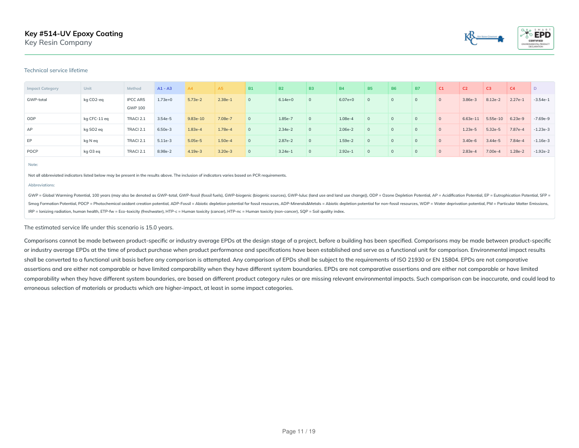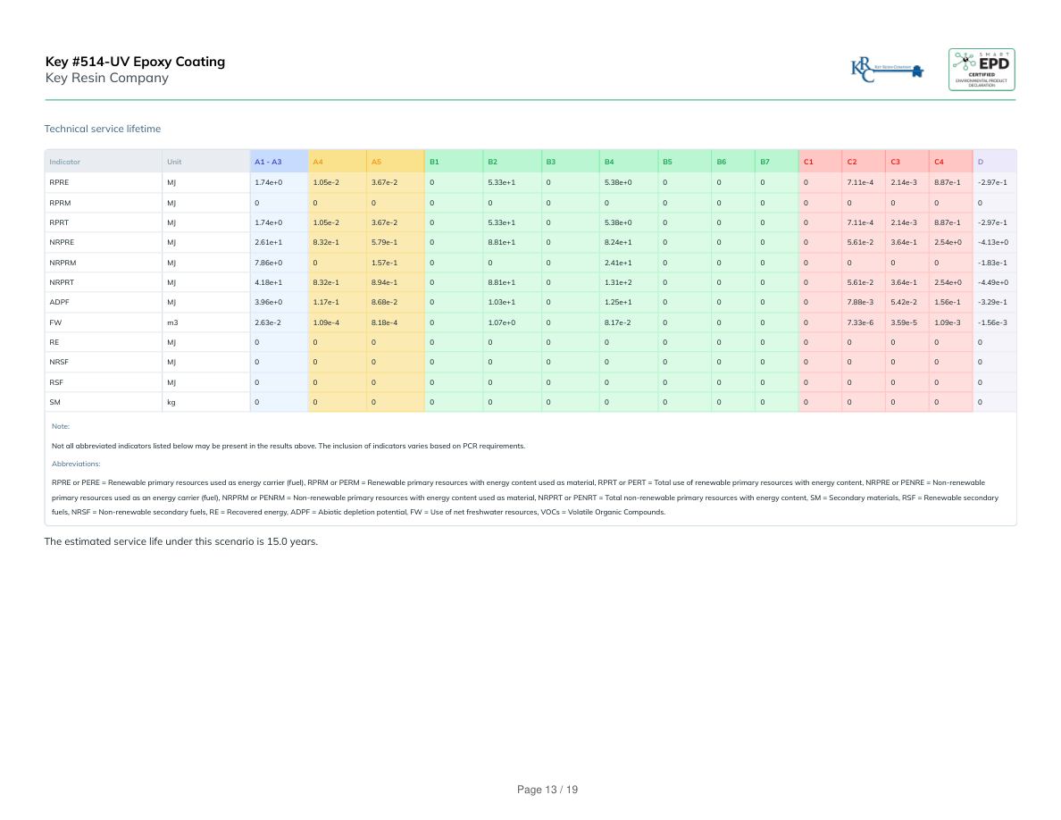 Technical service lifetimeIndicatorUnitA1 - A3A4A5B1B2B3B4B5B6B7C1C2C3C4DBio Carbon Removal fromProductkg CO2000000000000000Bio Carbon Emission fromProductkg CO2000000000000000Bio Carbon Removal fromPackagingkg CO2000000000000000Bio Carbon Emission fromPackagingkg CO2000000000000000Bio Carbon Emission from Wasteduring Manufacturing (renewablesource)kg CO2000000000000000Calcination Carbon Removalkg CO2000000000000000Carbonation Carbon Emissionkg CO2000000000000000Carbon Emission from Wasteduring Manufacturing (non-renewable source)kg CO2000000000000000Note:Not all abbreviated indicators listed below may be present in the results above. The inclusion of indicators varies based on PCR requirements.Abbreviations:BCRP = Biogenic Carbon Removal from Product, BCEP = Biogenic Carbon Emission from Product, BCRK = Biogenic Carbon Removal from Packaging, BCEK = Biogenic Carbon Emission from Packaging, BCEW = Biogenic Carbon Emission from Combustion of Waste from RenewableSources Used in Production Processes, CCE = Calcination Carbon Emissions, CCR = Carbonation Carbon Removals, CWNR = Carbon Emissions from Combustion of Waste from Non-Renewable Sources used in Production Processes, GWP-luc = Carbon Emissions from Land-use Change.The estimated service life under this scenario is 15.0 years. Key #514-UV Epoxy CoatingKey Resin CompanyPage 17 / 19