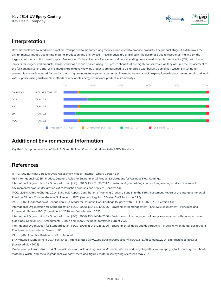 InterpretationRaw materials are sourced from suppliers, transported to manufacturing facilities, and mixed to produce products. The product stage (A1-A3) drives theenvironmental impact, due to raw material production and energy use. These impacts are amplified in the use phase due to recoatings, making B4 thelargest contributor to the overall impact. Market and Technical service life scenarios differ depending on assumed estimated service life (ESL), with lowerimpacts for longer-lived products. Those scenarios are constructed using PCR prescriptions that are highly conservative, as they assume the replacement ofthe full coating system. End-of-life impacts are relatively low, as products are assumed to be landfilled with building demolition waste. Switching torenewable energy is advised for products with high manufacturing energy demands. The manufacturer should explore lower-impact raw materials and workwith suppliers using sustainable methods or renewable energy to enhance product sustainability.\0%20%40%60%80%100%GWP-TotalIPCC AR5 GWP 100ODPTRACI 2.1APTRACI 2.1EPTRACI 2.1POCPTRACI 2.1Production (A1 - A3)Construction (A4 - A5)Use (B1 - B7)End of Life (C1 - C4)Additional Environmental InformationKey Resin is a proud member of the U.S. Green Building Council and adhere to its LEED Standards.ReferencesPARQ. (2025). PARQ Core Life Cycle Assessment Model – Internal Report: Version 1.0.NSF International. (2025). Product Category Rules for Environmental Product Declarations for Resinous Floor Coatings.International Organization for Standardization (ISO). (2017). ISO 21930:2017 – Sustainability in buildings and civil engineering works – Core rules forenvironmental product declarations of construction products and services. Geneva: ISO.IPCC. (2014). Climate Change 2014: Synthesis Report. Contribution of Working Groups I, II and III to the Fifth Assessment Report of the IntergovernmentalPanel on Climate Change. Geneva, Switzerland: IPCC. (Methodology for 100-year GWP factors in AR5)PARQ. (2025). Adaptation of Generic Core LCA Model for Resinous Floor Coatings (Aligned with NSF 111-2025 PCR): Version 1.0.International Organization for Standardization (ISO). (2006). ISO 14040:2006 – Environmental management – Life cycle assessment – Principles andframework. Geneva: ISO. (Amendment 1:2020; confirmed current 2022)International Organization for Standardization (ISO). (2006). ISO 14044:2006 – Environmental management – Life cycle assessment – Requirements andguidelines. Geneva: ISO. (Amendments 1:2017 and 2:2020 included; confirmed current 2022)International Organization for Standardization (ISO). (2006). ISO 14025:2006 – Environmental labels and declarations – Type III environmental declarations –Principles and procedures. Geneva: ISOPARQ. (2025). Verifier Dashboard v3.0.0 Manual.EPA Materials Management 2014 Fact Sheet, Table 2: https://www.epa.gov/sites/production/files/2016-11/documents/2014_smmfactsheet_508.pdf(Accessed May 2023)Plastics and pulp rates from EPA National Overview: Facts and Figures on Materials, Wastes and Recycling https://www.epa.gov/facts-and-figures-about-materials-waste-and-recycling/national-overview-facts-and-figures-materials#recycling (Accessed May 2023)Key #514-UV Epoxy CoatingKey Resin CompanyPage 18 / 19