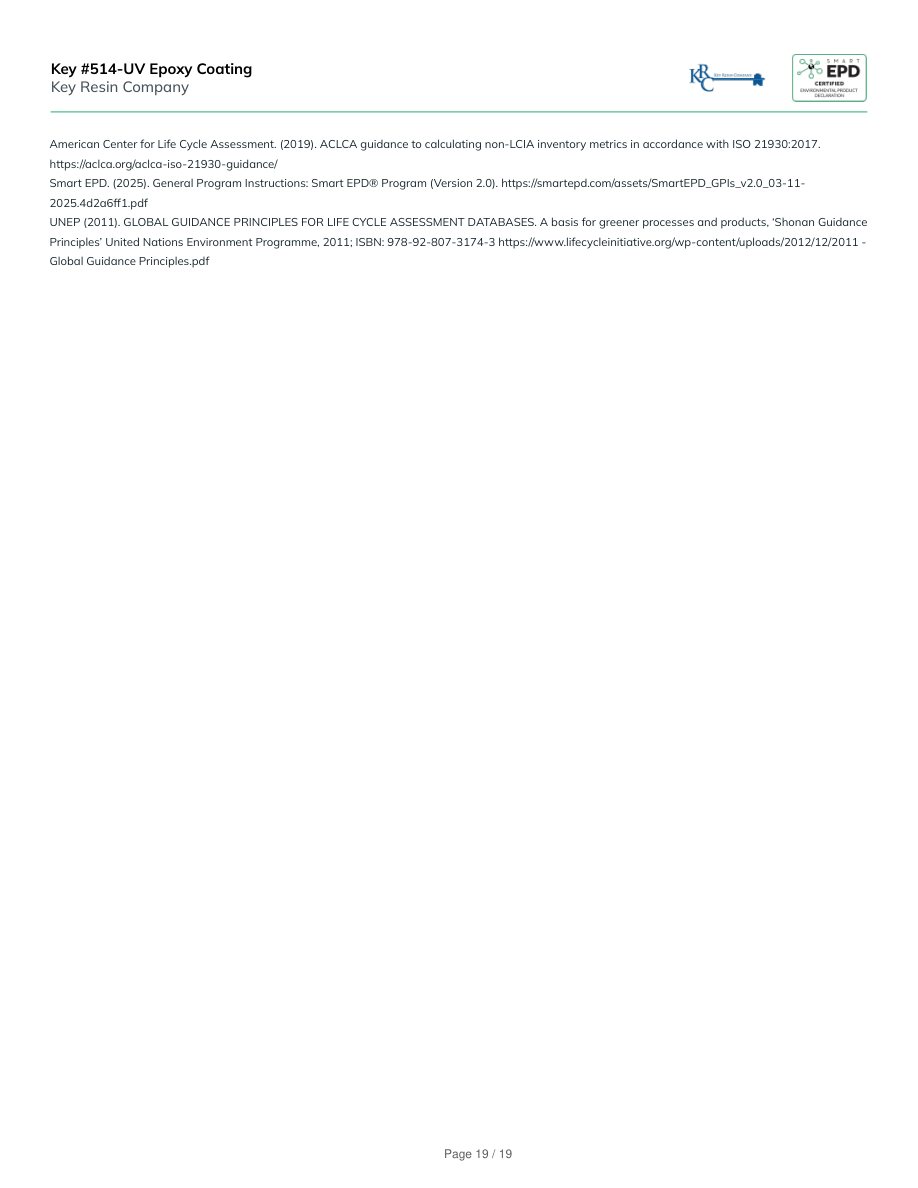 American Center for Life Cycle Assessment. (2019). ACLCA guidance to calculating non-LCIA inventory metrics in accordance with ISO 21930:2017.https://aclca.org/aclca-iso-21930-guidance/Smart EPD. (2025). General Program Instructions: Smart EPD® Program (Version 2.0). https://smartepd.com/assets/SmartEPD_GPIs_v2.0_03-11-2025.4d2a6ff1.pdfUNEP (2011). GLOBAL GUIDANCE PRINCIPLES FOR LIFE CYCLE ASSESSMENT DATABASES. A basis for greener processes and products, ‘Shonan GuidancePrinciples’ United Nations Environment Programme, 2011; ISBN: 978-92-807-3174-3 https://www.lifecycleinitiative.org/wp-content/uploads/2012/12/2011 -Global Guidance Principles.pdfKey #514-UV Epoxy CoatingKey Resin CompanyPage 19 / 19