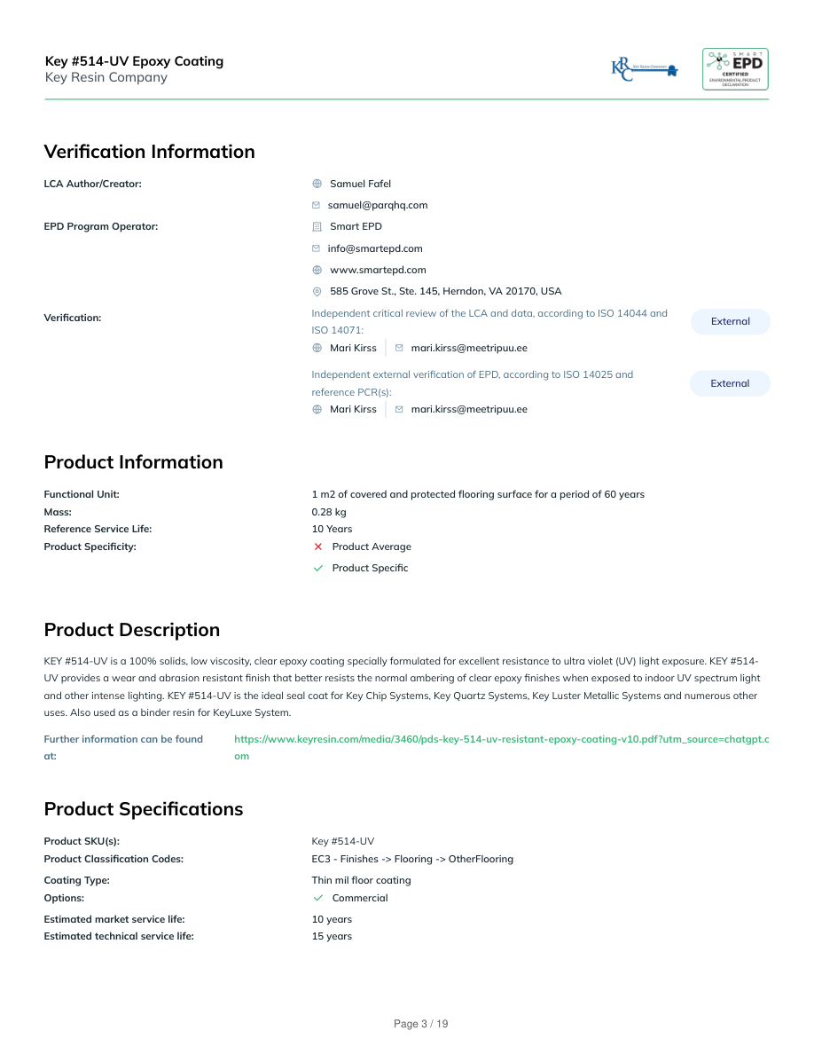 Verification InformationLCA Author/Creator:Samuel Fafelsamuel@parqhq.comEPD Program Operator:Smart EPDinfo@smartepd.comwww.smartepd.com585 Grove St., Ste. 145, Herndon, VA 20170, USAVerification:Independent critical review of the LCA and data, according to ISO 14044 andISO 14071:ExternalMari Kirssmari.kirss@meetripuu.eeIndependent external verification of EPD, according to ISO 14025 andreference PCR(s):ExternalMari Kirssmari.kirss@meetripuu.eeProduct InformationFunctional Unit:1 m2 of covered and protected flooring surface for a period of 60 yearsMass:0.28 kgReference Service Life:10 YearsProduct Specificity:Product AverageProduct SpecificProduct DescriptionKEY #514-UV is a 100% solids, low viscosity, clear epoxy coating specially formulated for excellent resistance to ultra violet (UV) light exposure. KEY #514-UV provides a wear and abrasion resistant finish that better resists the normal ambering of clear epoxy finishes when exposed to indoor UV spectrum lightand other intense lighting. KEY #514-UV is the ideal seal coat for Key Chip Systems, Key Quartz Systems, Key Luster Metallic Systems and numerous otheruses. Also used as a binder resin for KeyLuxe System.Further information can be foundat:https://www.keyresin.com/media/3460/pds-key-514-uv-resistant-epoxy-coating-v10.pdf?utm_source=chatgpt.comProduct SpecificationsProduct SKU(s):Key #514-UVProduct Classification Codes:EC3 - Finishes -> Flooring -> OtherFlooringCoating Type:Thin mil floor coatingOptions:CommercialEstimated market service life:10 yearsEstimated technical service life:15 yearsKey #514-UV Epoxy CoatingKey Resin CompanyPage 3 / 19