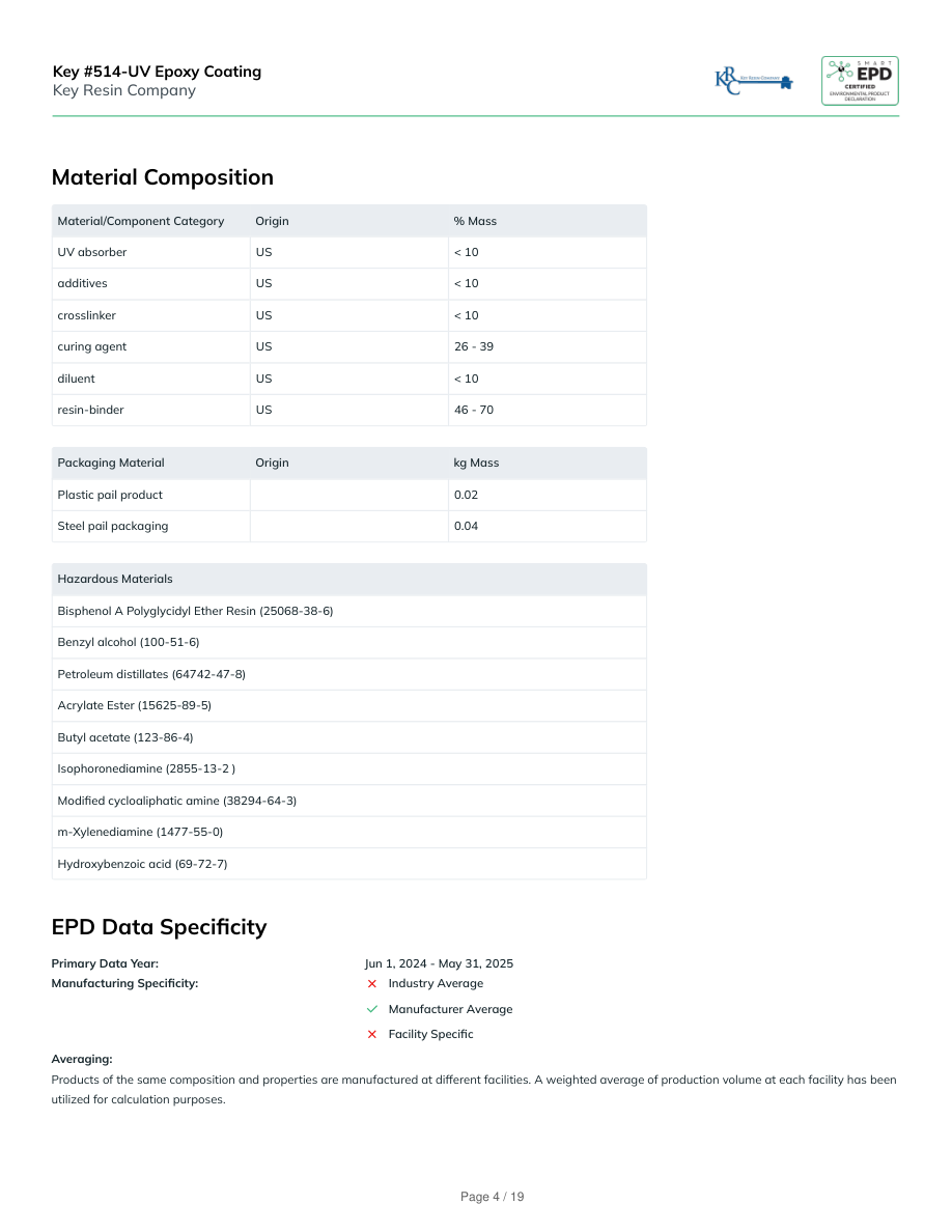 Material CompositionMaterial/Component CategoryOrigin% MassUV absorberUS< 10additivesUS< 10crosslinkerUS< 10curing agentUS26 - 39diluentUS< 10resin-binderUS46 - 70Packaging MaterialOriginkg MassPlastic pail product0.02Steel pail packaging0.04Hazardous MaterialsBisphenol A Polyglycidyl Ether Resin (25068-38-6)Benzyl alcohol (100-51-6)Petroleum distillates (64742-47-8)Acrylate Ester (15625-89-5)Butyl acetate (123-86-4)Isophoronediamine (2855-13-2 )Modified cycloaliphatic amine (38294-64-3)m-Xylenediamine (1477-55-0)Hydroxybenzoic acid (69-72-7)EPD Data SpecificityPrimary Data Year:Jun 1, 2024 - May 31, 2025Manufacturing Specificity:Industry AverageManufacturer AverageFacility SpecificAveraging:Products of the same composition and properties are manufactured at different facilities. A weighted average of production volume at each facility has beenutilized for calculation purposes.Key #514-UV Epoxy CoatingKey Resin CompanyPage 4 / 19