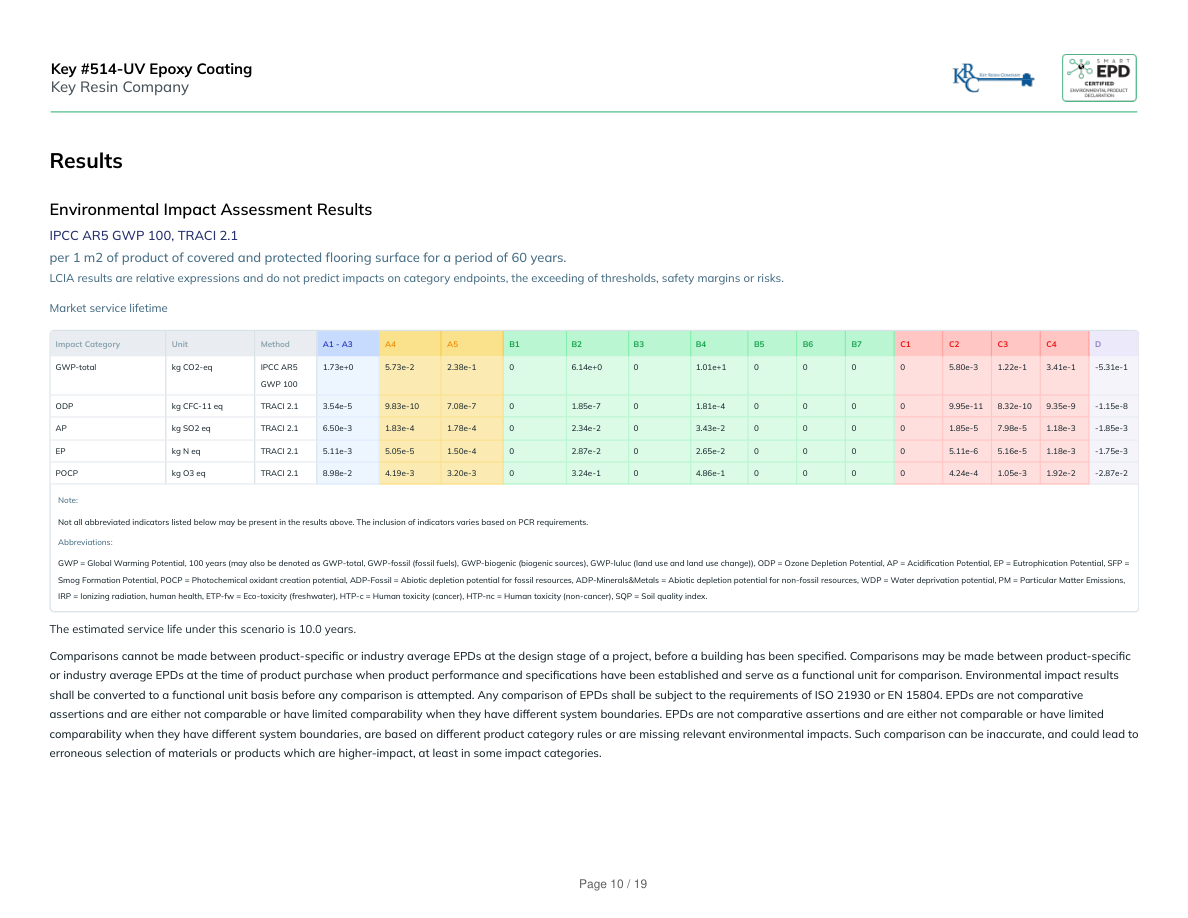 Waste and Output Flow Indicatorsper 1 m2 of product of covered and protected flooring surface for a period of 60 years.Market service lifetimeIndicatorUnitA1 - A3A4A5B1B2B3B4B5B6B7C1C2C3C4DHWDkg4.96e-409.91e-60002.53e-3000003.36e-21.68e+00NHWDkg1.20e-203.12e-20002.16e-100000000MRkg1.57e-202.51e-20002.04e-100000000MERkg3.77e-502.76e-30001.40e-200000000ILLRWm3000000000000000HLLRWm3000000000000000CRUkg000000000000000EEMJ1.16e-308.49e-20004.30e-1000001.03e+000Note:Not all abbreviated indicators listed below may be present in the results above. The inclusion of indicators varies based on PCR requirements.Abbreviations:HWD = Hazardous waste disposed, NHWD = Non-hazardous waste disposed, RWD = Radioactive waste disposed, HLRW = High-level radioactive waste, ILLRW = Intermediate- and low-level radioactive waste, CRU = Components for re-use, MFR or MR = Materials for recycling, MER= Materials for energy recovery, MNER = Materials for incineration, no energy recovery, EE or EEE = Recovered energy exported from the product system, EET = Exported thermal energy.The estimated service life under this scenario is 10.0 years. Significant data limitations currently exist within the LCI data used to generate waste metrics for Life Cycle Assessments and Environmental Product Declarations. The waste metrics were calculated in a way conformant with the requirements of ISO 21930:2017, but these values represent rough estimates and are for informational purposes only. As such, no decisions regarding actual cradle-grave waste performance between products should be derived from these reported values.Key #514-UV Epoxy CoatingKey Resin CompanyPage 14 / 19