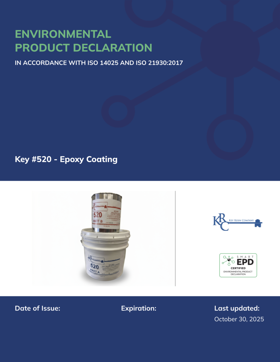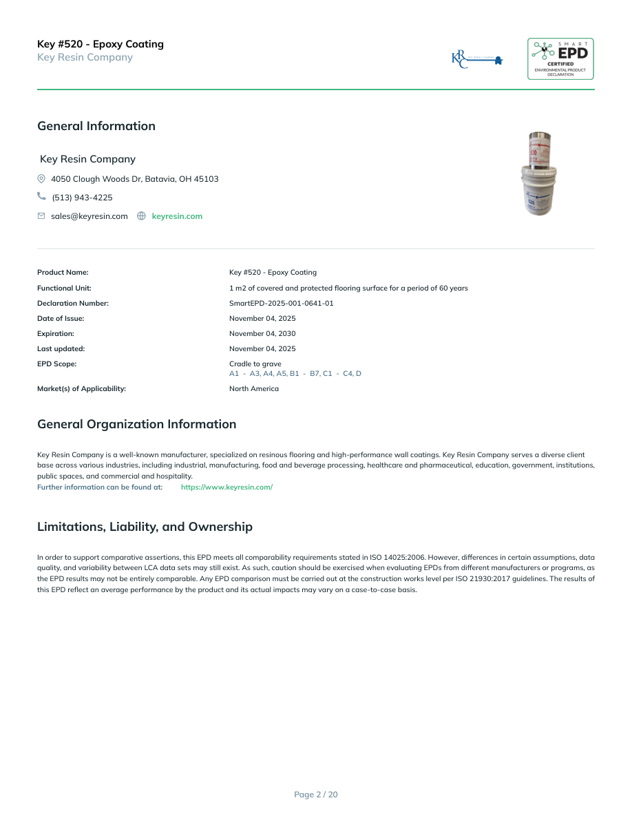 Key #520 - Epoxy CoatingKey Resin CompanyGeneral Information Key Resin Company 4050 Clough Woods Dr, Batavia, OH 45103(513) 943-4225sales@keyresin.comkeyresin.comProduct Name:Key #520 - Epoxy CoatingFunctional Unit:1 m2 of covered and protected flooring surface for a period of 60 yearsDeclaration Number:SmartEPD-2025-001-0641-01Date of Issue:November 04, 2025Expiration:November 04, 2030Last updated:November 04, 2025EPD Scope:Cradle to graveA1 - A3, A4, A5, B1 - B7, C1 - C4, D Market(s) of Applicability:North AmericaGeneral Organization InformationKey Resin Company is a well-known manufacturer, specialized on resinous flooring and high-performance wall coatings. Key Resin Company serves a diverse client base across various industries, including industrial, manufacturing, food and beverage processing, healthcare and pharmaceutical, education, government, institutions, public spaces, and commercial and hospitality.Further information can be found at:https://www.keyresin.com/Limitations, Liability, and OwnershipIn order to support comparative assertions, this EPD meets all comparability requirements stated in ISO 14025:2006. However, differences in certain assumptions, data quality, and variability between LCA data sets may still exist. As such, caution should be exercised when evaluating EPDs from different manufacturers or programs, as the EPD results may not be entirely comparable. Any EPD comparison must be carried out at the construction works level per ISO 21930:2017 guidelines. The results of this EPD reflect an average performance by the product and its actual impacts may vary on a case-to-case basis.Page 2 / 20