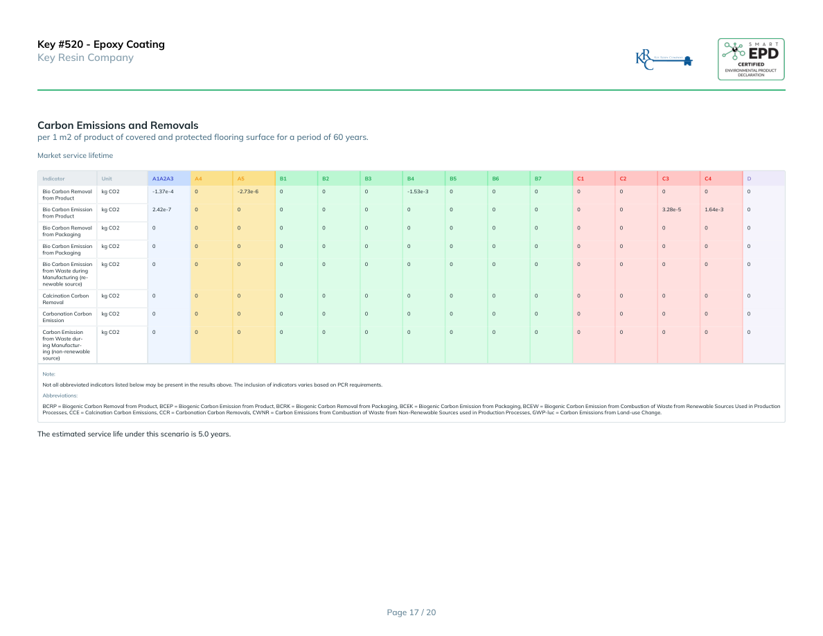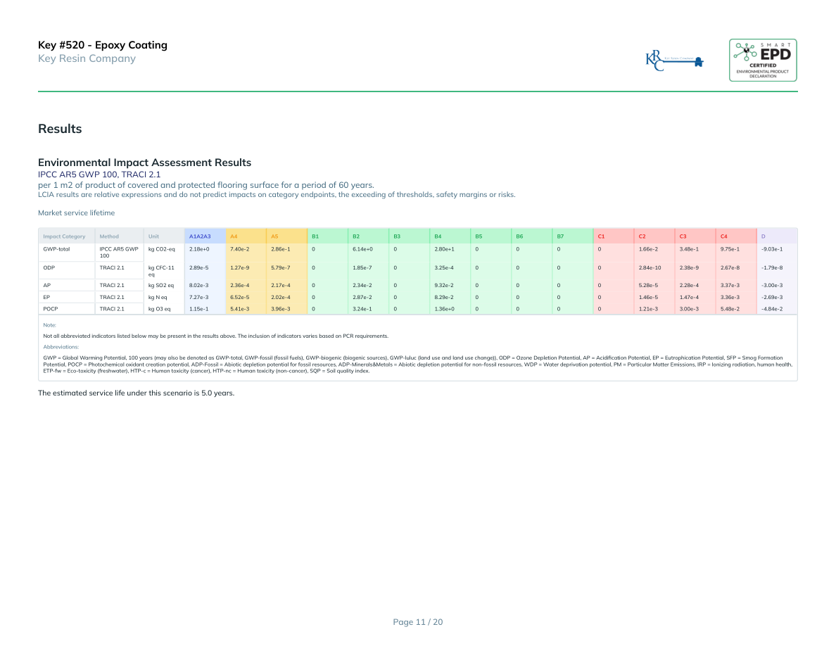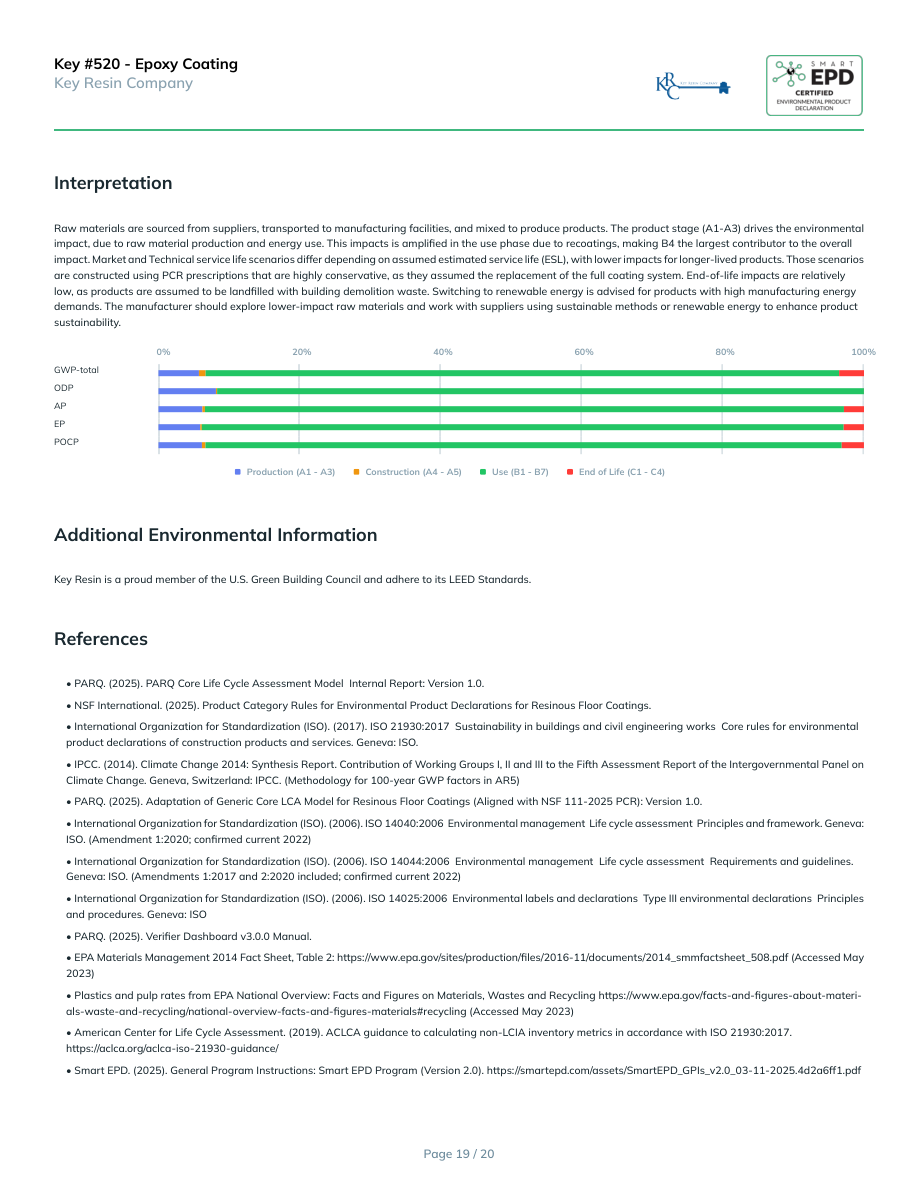 Key #520 - Epoxy CoatingKey Resin CompanyInterpretationRaw materials are sourced from suppliers, transported to manufacturing facilities, and mixed to produce products. The product stage (A1-A3) drives the environmental impact, due to raw material production and energy use. This impacts is amplified in the use phase due to recoatings, making B4 the largest contributor to the overall impact. Market and Technical service life scenarios differ depending on assumed estimated service life (ESL), with lower impacts for longer-lived products. Those scenarios are constructed using PCR prescriptions that are highly conservative, as they assumed the replacement of the full coating system. End-of-life impacts are relatively low, as products are assumed to be landfilled with building demolition waste. Switching to renewable energy is advised for products with high manufacturing energy demands. The manufacturer should explore lower-impact raw materials and work with suppliers using sustainable methods or renewable energy to enhance product sustainability.0%20%40%60%80%100%GWP-totalODPAPEPPOCPProduction (A1 - A3)Construction (A4 - A5)Use (B1 - B7)End of Life (C1 - C4)Additional Environmental InformationKey Resin is a proud member of the U.S. Green Building Council and adhere to its LEED Standards.References• PARQ. (2025). PARQ Core Life Cycle Assessment Model Internal Report: Version 1.0.• NSF International. (2025). Product Category Rules for Environmental Product Declarations for Resinous Floor Coatings.• International Organization for Standardization (ISO). (2017). ISO 21930:2017 Sustainability in buildings and civil engineering works Core rules for environmental product declarations of construction products and services. Geneva: ISO.• IPCC. (2014). Climate Change 2014: Synthesis Report. Contribution of Working Groups I, II and III to the Fifth Assessment Report of the Intergovernmental Panel on Climate Change. Geneva, Switzerland: IPCC. (Methodology for 100-year GWP factors in AR5)• PARQ. (2025). Adaptation of Generic Core LCA Model for Resinous Floor Coatings (Aligned with NSF 111-2025 PCR): Version 1.0.• International Organization for Standardization (ISO). (2006). ISO 14040:2006 Environmental management Life cycle assessment Principles and framework. Geneva: ISO. (Amendment 1:2020; confirmed current 2022)• International Organization for Standardization (ISO). (2006). ISO 14044:2006 Environmental management Life cycle assessment Requirements and guidelines. Geneva: ISO. (Amendments 1:2017 and 2:2020 included; confirmed current 2022)• International Organization for Standardization (ISO). (2006). ISO 14025:2006 Environmental labels and declarations Type III environmental declarations Principles and procedures. Geneva: ISO• PARQ. (2025). Verifier Dashboard v3.0.0 Manual.• EPA Materials Management 2014 Fact Sheet, Table 2: https://www.epa.gov/sites/production/files/2016-11/documents/2014_smmfactsheet_508.pdf (Accessed May 2023)• Plastics and pulp rates from EPA National Overview: Facts and Figures on Materials, Wastes and Recycling https://www.epa.gov/facts-and-figures-about-materi-als-waste-and-recycling/national-overview-facts-and-figures-materials#recycling (Accessed May 2023)• American Center for Life Cycle Assessment. (2019). ACLCA guidance to calculating non-LCIA inventory metrics in accordance with ISO 21930:2017. https://aclca.org/aclca-iso-21930-guidance/• Smart EPD. (2025). General Program Instructions: Smart EPD Program (Version 2.0). https://smartepd.com/assets/SmartEPD_GPIs_v2.0_03-11-2025.4d2a6ff1.pdfPage 19 / 20