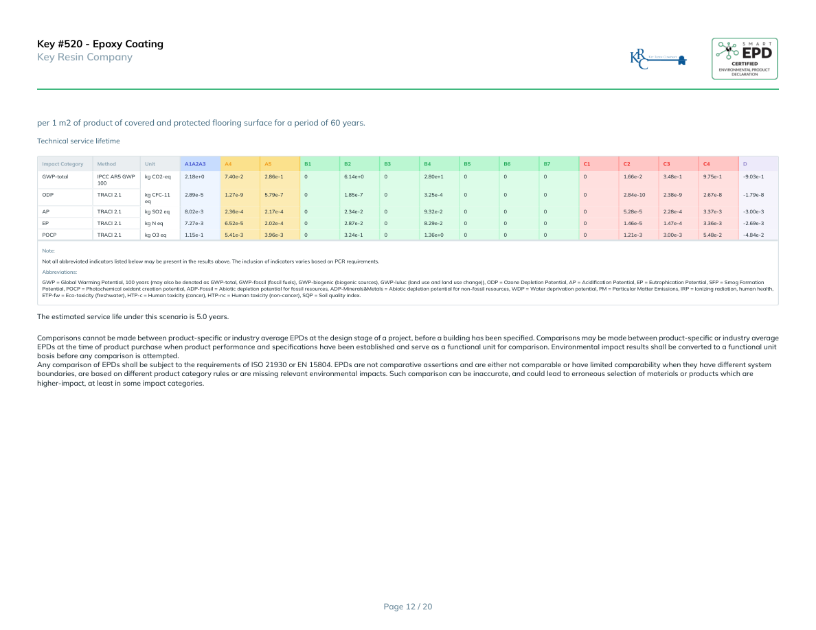 Key #520 - Epoxy CoatingKey Resin Companyper 1 m2 of product of covered and protected flooring surface for a period of 60 years.Technical service lifetimeImpact CategoryMethodUnitA1A2A3A4A5B1B2B3B4B5B6B7C1C2C3C4DGWP-totalIPCC AR5 GWP 100kg CO2-eq2.18e+07.40e-22.86e-106.14e+002.80e+100001.66e-23.48e-19.75e-1-9.03e-1ODPTRACI 2.1kg CFC-11 eq2.89e-51.27e-95.79e-701.85e-703.25e-400002.84e-102.38e-92.67e-8-1.79e-8APTRACI 2.1kg SO2 eq8.02e-32.36e-42.17e-402.34e-209.32e-200005.28e-52.28e-43.37e-3-3.00e-3EPTRACI 2.1kg N eq7.27e-36.52e-52.02e-402.87e-208.29e-200001.46e-51.47e-43.36e-3-2.69e-3POCPTRACI 2.1kg O3 eq1.15e-15.41e-33.96e-303.24e-101.36e+000001.21e-33.00e-35.48e-2-4.84e-2Note:Not all abbreviated indicators listed below may be present in the results above. The inclusion of indicators varies based on PCR requirements.Abbreviations:GWP = Global Warming Potential, 100 years (may also be denoted as GWP-total, GWP-fossil (fossil fuels), GWP-biogenic (biogenic sources), GWP-luluc (land use and land use change)), ODP = Ozone Depletion Potential, AP = Acidification Potential, EP = Eutrophication Potential, SFP = Smog Formation Potential, POCP = Photochemical oxidant creation potential, ADP-Fossil = Abiotic depletion potential for fossil resources, ADP-Minerals&Metals = Abiotic depletion potential for non-fossil resources, WDP = Water deprivation potential, PM = Particular Matter Emissions, IRP = Ionizing radiation, human health, ETP-fw = Eco-toxicity (freshwater), HTP-c = Human toxicity (cancer), HTP-nc = Human toxicity (non-cancer), SQP = Soil quality index.The estimated service life under this scenario is 5.0 years.Comparisons cannot be made between product-specific or industry average EPDs at the design stage of a project, before a building has been specified. Comparisons may be made between product-specific or industry average EPDs at the time of product purchase when product performance and specifications have been established and serve as a functional unit for comparison. Environmental impact results shall be converted to a functional unit basis before any comparison is attempted.Any comparison of EPDs shall be subject to the requirements of ISO 21930 or EN 15804. EPDs are not comparative assertions and are either not comparable or have limited comparability when they have different system boundaries, are based on different product category rules or are missing relevant environmental impacts. Such comparison can be inaccurate, and could lead to erroneous selection of materials or products which are higher-impact, at least in some impact categories.Page 12 / 20