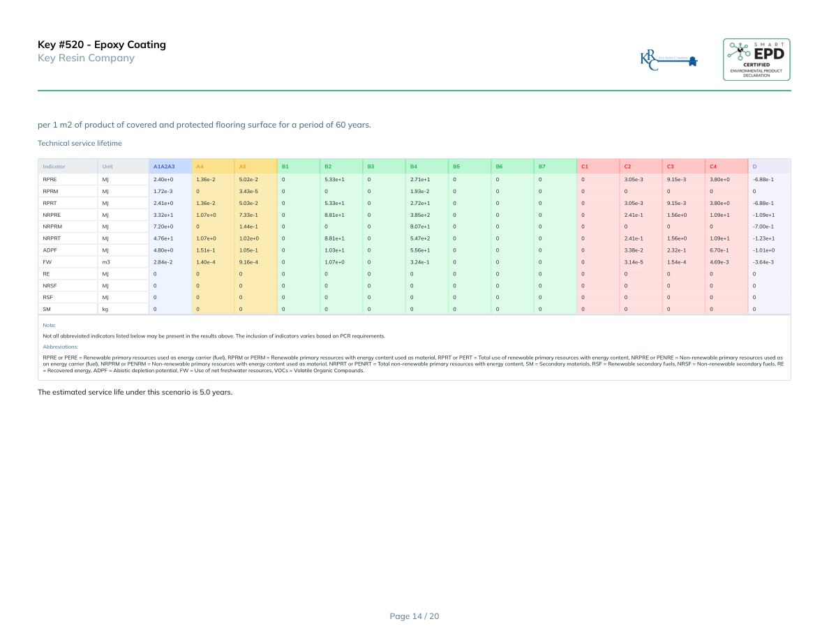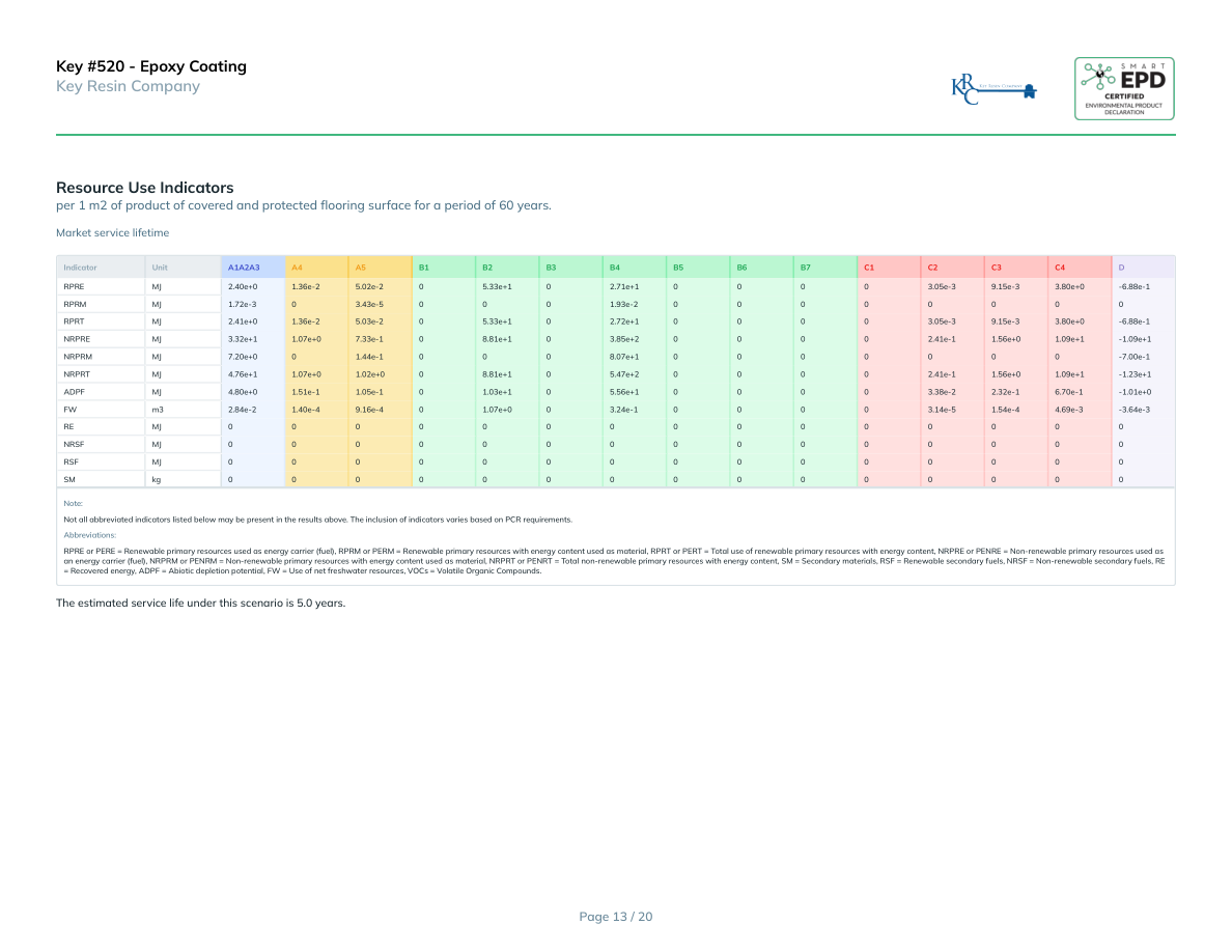 Key #520 - Epoxy CoatingKey Resin Companyper 1 m2 of product of covered and protected flooring surface for a period of 60 years.Technical service lifetimeIndicatorUnitA1A2A3A4A5B1B2B3B4B5B6B7C1C2C3C4DRPREMJ2.40e+01.36e-25.02e-205.33e+102.71e+100003.05e-39.15e-33.80e+0-6.88e-1RPRMMJ1.72e-303.43e-50001.93e-200000000RPRTMJ2.41e+01.36e-25.03e-205.33e+102.72e+100003.05e-39.15e-33.80e+0-6.88e-1NRPREMJ3.32e+11.07e+07.33e-108.81e+103.85e+200002.41e-11.56e+01.09e+1-1.09e+1NRPRMMJ7.20e+001.44e-10008.07e+10000000-7.00e-1NRPRTMJ4.76e+11.07e+01.02e+008.81e+105.47e+200002.41e-11.56e+01.09e+1-1.23e+1ADPFMJ4.80e+01.51e-11.05e-101.03e+105.56e+100003.38e-22.32e-16.70e-1-1.01e+0FWm32.84e-21.40e-49.16e-401.07e+003.24e-100003.14e-51.54e-44.69e-3-3.64e-3REMJ000000000000000NRSFMJ000000000000000RSFMJ000000000000000SMkg000000000000000Note:Not all abbreviated indicators listed below may be present in the results above. The inclusion of indicators varies based on PCR requirements.Abbreviations:RPRE or PERE = Renewable primary resources used as energy carrier (fuel), RPRM or PERM = Renewable primary resources with energy content used as material, RPRT or PERT = Total use of renewable primary resources with energy content, NRPRE or PENRE = Non-renewable primary resources used as an energy carrier (fuel), NRPRM or PENRM = Non-renewable primary resources with energy content used as material, NRPRT or PENRT = Total non-renewable primary resources with energy content, SM = Secondary materials, RSF = Renewable secondary fuels, NRSF = Non-renewable secondary fuels, RE = Recovered energy, ADPF = Abiotic depletion potential, FW = Use of net freshwater resources, VOCs = Volatile Organic Compounds.The estimated service life under this scenario is 5.0 years.Page 14 / 20
