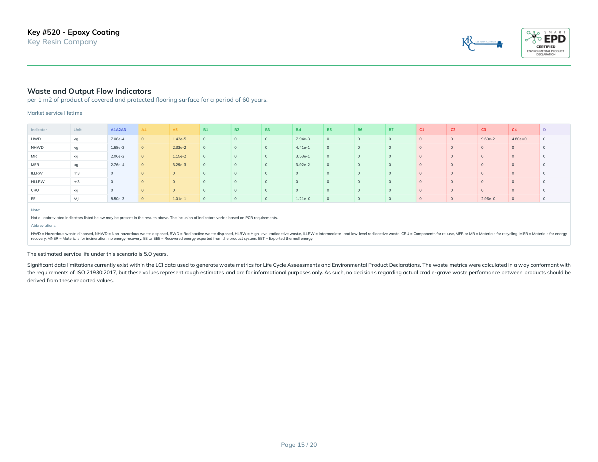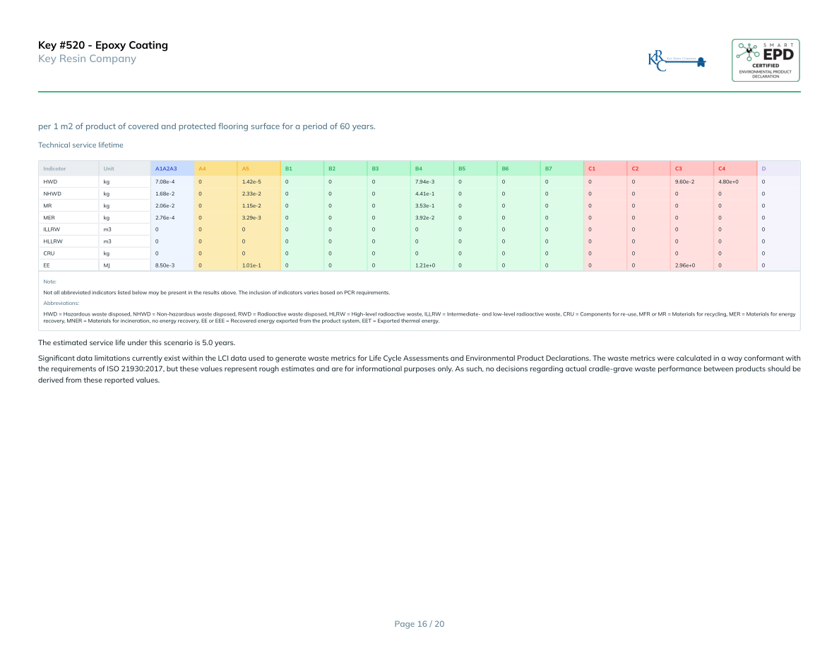 Key #520 - Epoxy CoatingKey Resin Companyper 1 m2 of product of covered and protected flooring surface for a period of 60 years.Technical service lifetimeIndicatorUnitA1A2A3A4A5B1B2B3B4B5B6B7C1C2C3C4DHWDkg7.08e-401.42e-50007.94e-3000009.60e-24.80e+00NHWDkg1.68e-202.33e-20004.41e-100000000MRkg2.06e-201.15e-20003.53e-100000000MERkg2.76e-403.29e-30003.92e-200000000ILLRWm3000000000000000HLLRWm3000000000000000CRUkg000000000000000EEMJ8.50e-301.01e-10001.21e+0000002.96e+000Note:Not all abbreviated indicators listed below may be present in the results above. The inclusion of indicators varies based on PCR requirements.Abbreviations:HWD = Hazardous waste disposed, NHWD = Non-hazardous waste disposed, RWD = Radioactive waste disposed, HLRW = High-level radioactive waste, ILLRW = Intermediate- and low-level radioactive waste, CRU = Components for re-use, MFR or MR = Materials for recycling, MER = Materials for energy recovery, MNER = Materials for incineration, no energy recovery, EE or EEE = Recovered energy exported from the product system, EET = Exported thermal energy.The estimated service life under this scenario is 5.0 years. Significant data limitations currently exist within the LCI data used to generate waste metrics for Life Cycle Assessments and Environmental Product Declarations. The waste metrics were calculated in a way conformant with the requirements of ISO 21930:2017, but these values represent rough estimates and are for informational purposes only. As such, no decisions regarding actual cradle-grave waste performance between products should be derived from these reported values.Page 16 / 20