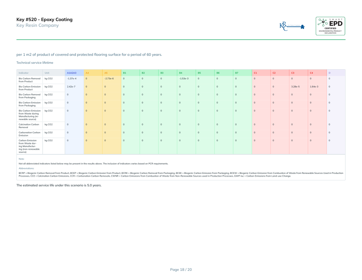 Key #520 - Epoxy CoatingKey Resin Companyper 1 m2 of product of covered and protected flooring surface for a period of 60 years.Technical service lifetimeIndicatorUnitA1A2A3A4A5B1B2B3B4B5B6B7C1C2C3C4DBio Carbon Removal from Productkg CO2-1.37e-40-2.73e-6000-1.53e-300000000Bio Carbon Emission from Productkg CO22.42e-7000000000003.28e-51.64e-30Bio Carbon Removal from Packagingkg CO2000000000000000Bio Carbon Emission from Packagingkg CO2000000000000000Bio Carbon Emission from Waste during Manufacturing (re-newable source)kg CO2000000000000000Calcination Carbon Removalkg CO2000000000000000Carbonation Carbon Emissionkg CO2000000000000000Carbon Emission from Waste dur-ing Manufactur-ing (non-renewable source)kg CO2000000000000000Note:Not all abbreviated indicators listed below may be present in the results above. The inclusion of indicators varies based on PCR requirements.Abbreviations:BCRP = Biogenic Carbon Removal from Product, BCEP = Biogenic Carbon Emission from Product, BCRK = Biogenic Carbon Removal from Packaging, BCEK = Biogenic Carbon Emission from Packaging, BCEW = Biogenic Carbon Emission from Combustion of Waste from Renewable Sources Used in Production Processes, CCE = Calcination Carbon Emissions, CCR = Carbonation Carbon Removals, CWNR = Carbon Emissions from Combustion of Waste from Non-Renewable Sources used in Production Processes, GWP-luc = Carbon Emissions from Land-use Change.The estimated service life under this scenario is 5.0 years.Page 18 / 20