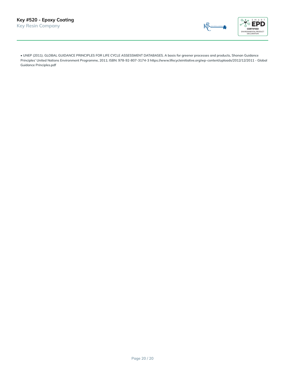 Key #520 - Epoxy CoatingKey Resin Company• UNEP (2011). GLOBAL GUIDANCE PRINCIPLES FOR LIFE CYCLE ASSESSMENT DATABASES. A basis for greener processes and products, Shonan Guidance Principles’ United Nations Environment Programme, 2011; ISBN: 978-92-807-3174-3 https://www.lifecycleinitiative.org/wp-content/uploads/2012/12/2011 - Global Guidance Principles.pdf Page 20 / 20