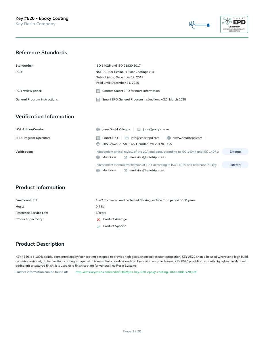 Key #520 - Epoxy CoatingKey Resin CompanyReference StandardsStandard(s):ISO 14025 and ISO 21930:2017PCR:NSF PCR for Resinous Floor Coatings v.1eDate of issue: December 17, 2018Valid until: December 31, 2025PCR review panel:Contact Smart EPD for more information.General Program Instructions:Smart EPD General Program Instructions v.2.0, March 2025Verification InformationLCA Author/Creator:Juan David Villegasjuan@parqhq.comEPD Program Operator:Smart EPDinfo@smartepd.comwww.smartepd.com585 Grove St., Ste. 145, Herndon, VA 20170, USAVerification:Independent critical review of the LCA and data, according to ISO 14044 and ISO 14071:ExternalMari Kirssmari.kirss@meetripuu.eeIndependent external verification of EPD, according to ISO 14025 and reference PCR(s):ExternalMari Kirssmari.kirss@meetripuu.eeProduct InformationFunctional Unit:1 m2 of covered and protected flooring surface for a period of 60 yearsMass:0.4 kgReference Service Life:5 YearsProduct Specificity:Product AverageProduct SpecificProduct DescriptionKEY #520 is a 100% solids, pigmented epoxy floor coating designed to provide high gloss, chemical resistant protection. KEY #520 should be used wherever a high build, corrosive resistant, protective floor coating is required. It is essentially odorless and can be used in occupied areas. KEY #520 provides a smooth high gloss finish or with added grit a textured finish. It is used as a finish coating for various Key Resin Systems.Further information can be found at:http://cms.keyresin.com/media/3462/pds-key-520-epoxy-coating-100-solids-v20.pdfPage 3 / 20