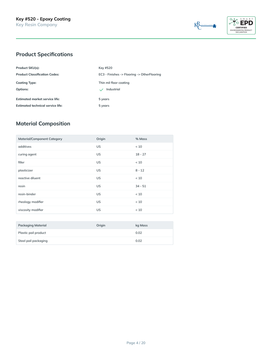 Key #520 - Epoxy CoatingKey Resin CompanyProduct SpecificationsProduct SKU(s):Key #520Product Classification Codes:EC3 - Finishes -> Flooring -> OtherFlooringCoating Type:Thin mil floor coatingOptions:IndustrialEstimated market service life:5 yearsEstimated technical service life:5 yearsMaterial CompositionMaterial/Component CategoryOrigin% MassadditivesUS< 10curing agentUS18 - 27fillerUS< 10plasticizerUS8 - 12reactive diluentUS< 10resinUS34 - 51resin-binderUS< 10rheology modifierUS< 10viscosity modifierUS< 10Packaging MaterialOriginkg MassPlastic pail product 0.02Steel pail packaging 0.02Page 4 / 20