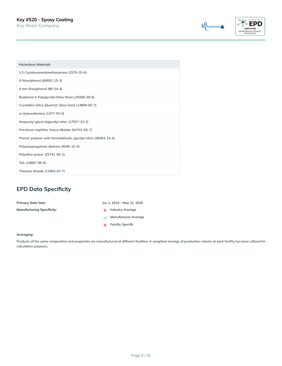 Key #520 - Epoxy CoatingKey Resin CompanyHazardous Materials1,3-Cyclohexanedimethanamine (2579-20-6)4-Nonylphenol (84852-15-3)4-tert-Butylphenol (98-54-4)Bisphenol A Polyglycidyl Ether Resin (25068-38-6)Crystalline Silica (Quartz)/ Silica Sand (14808-60-7)m-Xylenediamine (1477-55-0)Neopentyl glycol diglycidyl ether (17557-23-2)Petroleum naphtha, heavy alkylate (64741-65-7)Phenol, polymer with formaldehyde, glycidyl ether (28064-14-4)Poly(oxypropylene) diamine (9046-10-0)Polyether polyol (25791-96-2)Talc (14807-96-6)Titanium dioxide (13463-67-7)EPD Data SpecificityPrimary Data Year:Jun 1, 2024 - May 31, 2025Manufacturing Specificity:Industry AverageManufacturer AverageFacility SpecificAveraging:Products of the same composition and properties are manufactured at different facilities. A weighted average of production volume at each facility has been utilized for calculation purposes.Page 5 / 20