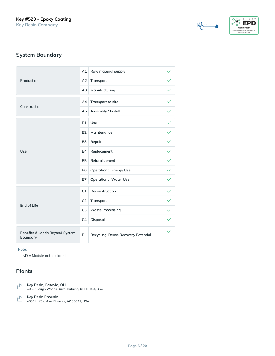 Key #520 - Epoxy CoatingKey Resin CompanySystem BoundaryProductionA1Raw material supplyA2TransportA3ManufacturingConstructionA4Transport to siteA5Assembly / InstallUseB1UseB2MaintenanceB3RepairB4ReplacementB5RefurbishmentB6Operational Energy UseB7Operational Water UseEnd of LifeC1DeconstructionC2TransportC3Waste ProcessingC4DisposalBenefits & Loads Beyond System BoundaryDRecycling, Reuse Recovery PotentialNote:ND = Module not declaredPlantsKey Resin, Batavia, OH4050 Clough Woods Drive, Batavia, OH 45103, USAKey Resin Phoenix4330 N 43rd Ave, Phoenix, AZ 85031, USAPage 6 / 20
