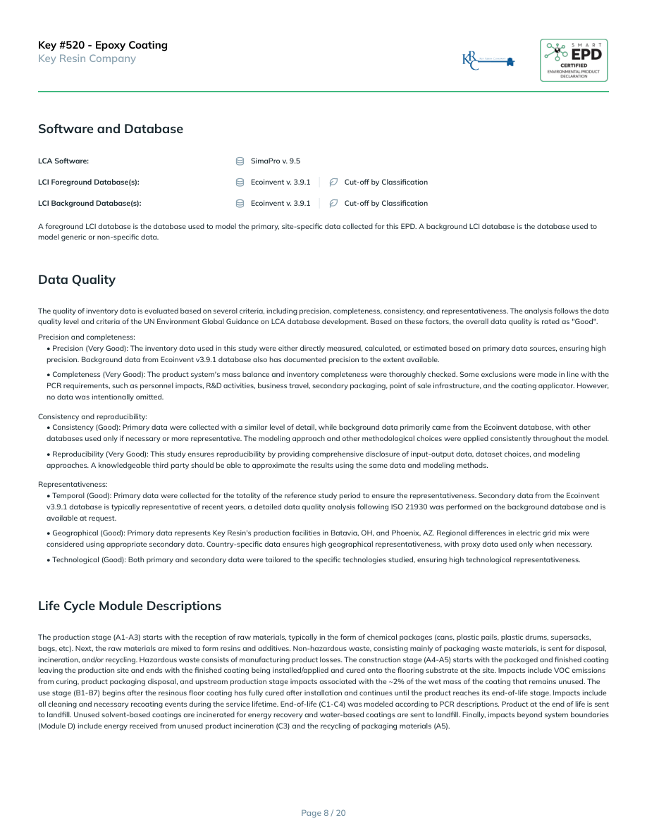 Key #520 - Epoxy CoatingKey Resin CompanySoftware and DatabaseLCA Software:SimaPro v. 9.5LCI Foreground Database(s):Ecoinvent v. 3.9.1Cut-off by ClassificationLCI Background Database(s):Ecoinvent v. 3.9.1Cut-off by ClassificationA foreground LCI database is the database used to model the primary, site-specific data collected for this EPD. A background LCI database is the database used to model generic or non-specific data.Data QualityThe quality of inventory data is evaluated based on several criteria, including precision, completeness, consistency, and representativeness. The analysis follows the data quality level and criteria of the UN Environment Global Guidance on LCA database development. Based on these factors, the overall data quality is rated as "Good".Precision and completeness:• Precision (Very Good): The inventory data used in this study were either directly measured, calculated, or estimated based on primary data sources, ensuring high precision. Background data from Ecoinvent v3.9.1 database also has documented precision to the extent available.• Completeness (Very Good): The product system's mass balance and inventory completeness were thoroughly checked. Some exclusions were made in line with the PCR requirements, such as personnel impacts, R&D activities, business travel, secondary packaging, point of sale infrastructure, and the coating applicator. However, no data was intentionally omitted.Consistency and reproducibility:• Consistency (Good): Primary data were collected with a similar level of detail, while background data primarily came from the Ecoinvent database, with other databases used only if necessary or more representative. The modeling approach and other methodological choices were applied consistently throughout the model.• Reproducibility (Very Good): This study ensures reproducibility by providing comprehensive disclosure of input-output data, dataset choices, and modeling approaches. A knowledgeable third party should be able to approximate the results using the same data and modeling methods.Representativeness:• Temporal (Good): Primary data were collected for the totality of the reference study period to ensure the representativeness. Secondary data from the Ecoinvent v3.9.1 database is typically representative of recent years, a detailed data quality analysis following ISO 21930 was performed on the background database and is available at request.• Geographical (Good): Primary data represents Key Resin's production facilities in Batavia, OH, and Phoenix, AZ. Regional differences in electric grid mix were considered using appropriate secondary data. Country-specific data ensures high geographical representativeness, with proxy data used only when necessary.• Technological (Good): Both primary and secondary data were tailored to the specific technologies studied, ensuring high technological representativeness.Life Cycle Module DescriptionsThe production stage (A1-A3) starts with the reception of raw materials, typically in the form of chemical packages (cans, plastic pails, plastic drums, supersacks, bags, etc). Next, the raw materials are mixed to form resins and additives. Non-hazardous waste, consisting mainly of packaging waste materials, is sent for disposal, incineration, and/or recycling. Hazardous waste consists of manufacturing product losses. The construction stage (A4-A5) starts with the packaged and finished coating leaving the production site and ends with the finished coating being installed/applied and cured onto the flooring substrate at the site. Impacts include VOC emissions from curing, product packaging disposal, and upstream production stage impacts associated with the ~2% of the wet mass of the coating that remains unused. The use stage (B1-B7) begins after the resinous floor coating has fully cured after installation and continues until the product reaches its end-of-life stage. Impacts include all cleaning and necessary recoating events during the service lifetime. End-of-life (C1-C4) was modeled according to PCR descriptions. Product at the end of life is sent to landfill. Unused solvent-based coatings are incinerated for energy recovery and water-based coatings are sent to landfill. Finally, impacts beyond system boundaries (Module D) include energy received from unused product incineration (C3) and the recycling of packaging materials (A5).Page 8 / 20