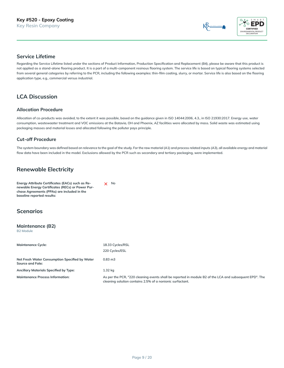 Key #520 - Epoxy CoatingKey Resin CompanyService LifetimeRegarding the Service Lifetime listed under the sections of Product Information, Production Specification and Replacement (B4), please be aware that this product is not applied as a stand-alone flooring product. It is a part of a multi-component resinous flooring system. The service life is based on typical flooring systems selected from several general categories by referring to the PCR, including the following examples: thin-film coating, slurry, or mortar. Service life is also based on the flooring application type, e.g., commercial versus industrial.LCA DiscussionAllocation ProcedureAllocation of co-products was avoided, to the extent it was possible, based on the guidance given in ISO 14044:2006, 4.3., in ISO 21930:2017. Energy use, water consumption, wastewaater treatment and VOC emissions at the Batavia, OH and Phoenix, AZ facilities were allocated by mass. Solid waste was estimated using packaging masses and material losses and allocated following the polluter pays principle.Cut-off ProcedureThe system boundary was defined based on relevance to the goal of the study. For the raw material (A1) and process related inputs (A3), all available energy and material flow data have been included in the model. Exclusions allowed by the PCR such as secondary and tertiary packaging, were implemented.Renewable ElectricityEnergy Attribute Certificates (EACs) such as Re-newable Energy Certificates (RECs) or Power Pur-chase Agreements (PPAs) are included in the baseline reported results:NoScenariosMaintenance (B2)B2 ModuleMaintenance Cycle:18.33 Cycles/RSL220 Cycles/ESLNet Fresh Water Consumption Specified by Water Source and Fate:0.83 m3Ancillary Materials Specified by Type:1.32 kgMaintenance Process Information:As per the PCR, "220 cleaning events shall be reported in module B2 of the LCA and subsequent EPD". The cleaning solution contains 2.5% of a nonionic surfactant.Page 9 / 20