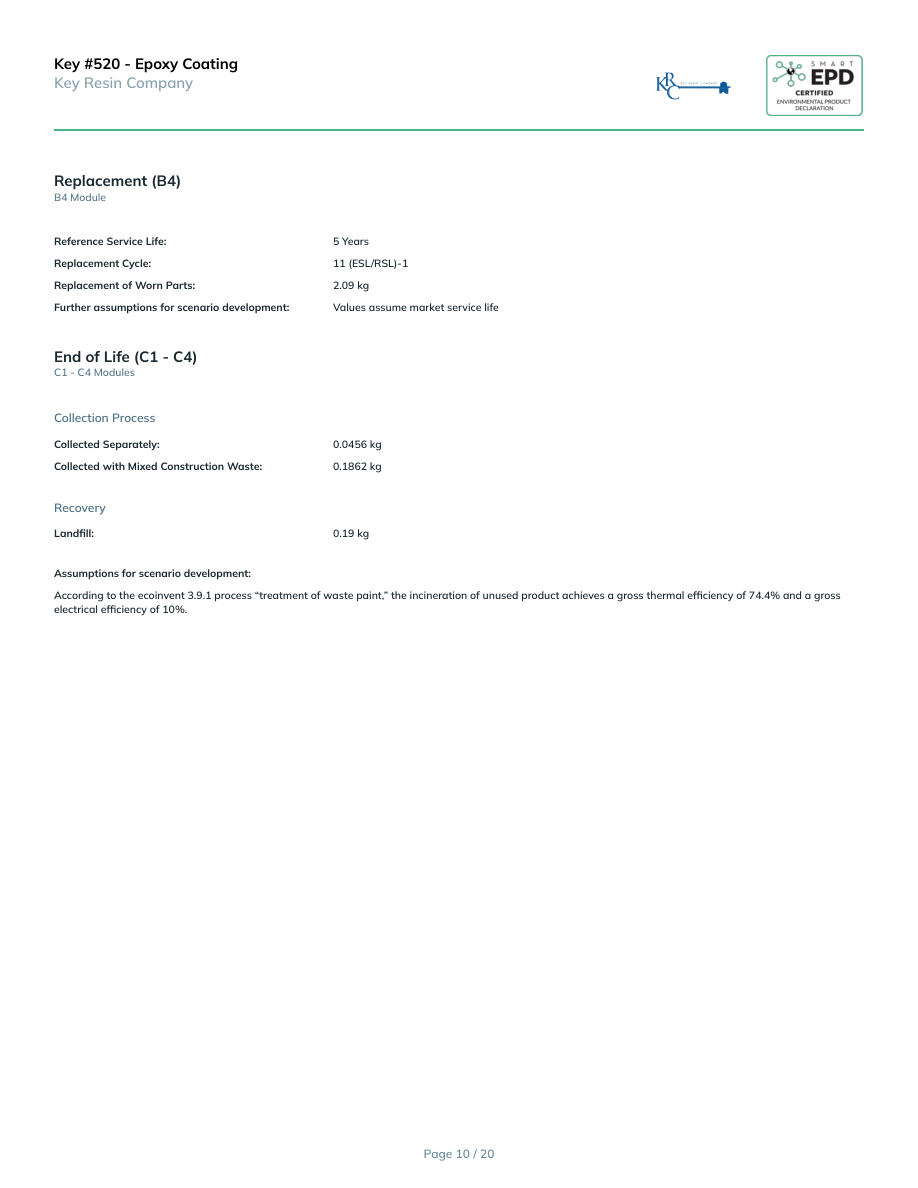 Key #520 - Epoxy CoatingKey Resin CompanyReplacement (B4)B4 ModuleReference Service Life:5 YearsReplacement Cycle:11 (ESL/RSL)-1Replacement of Worn Parts:2.09 kgFurther assumptions for scenario development:Values assume market service lifeEnd of Life (C1 - C4)C1 - C4 ModulesCollection ProcessCollected Separately:0.0456 kgCollected with Mixed Construction Waste:0.1862 kgRecoveryLandfill:0.19 kgAssumptions for scenario development:According to the ecoinvent 3.9.1 process “treatment of waste paint,” the incineration of unused product achieves a gross thermal efficiency of 74.4% and a gross electrical efficiency of 10%.Page 10 / 20