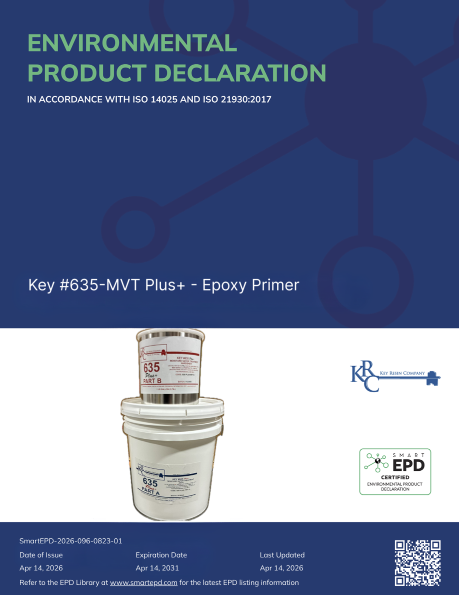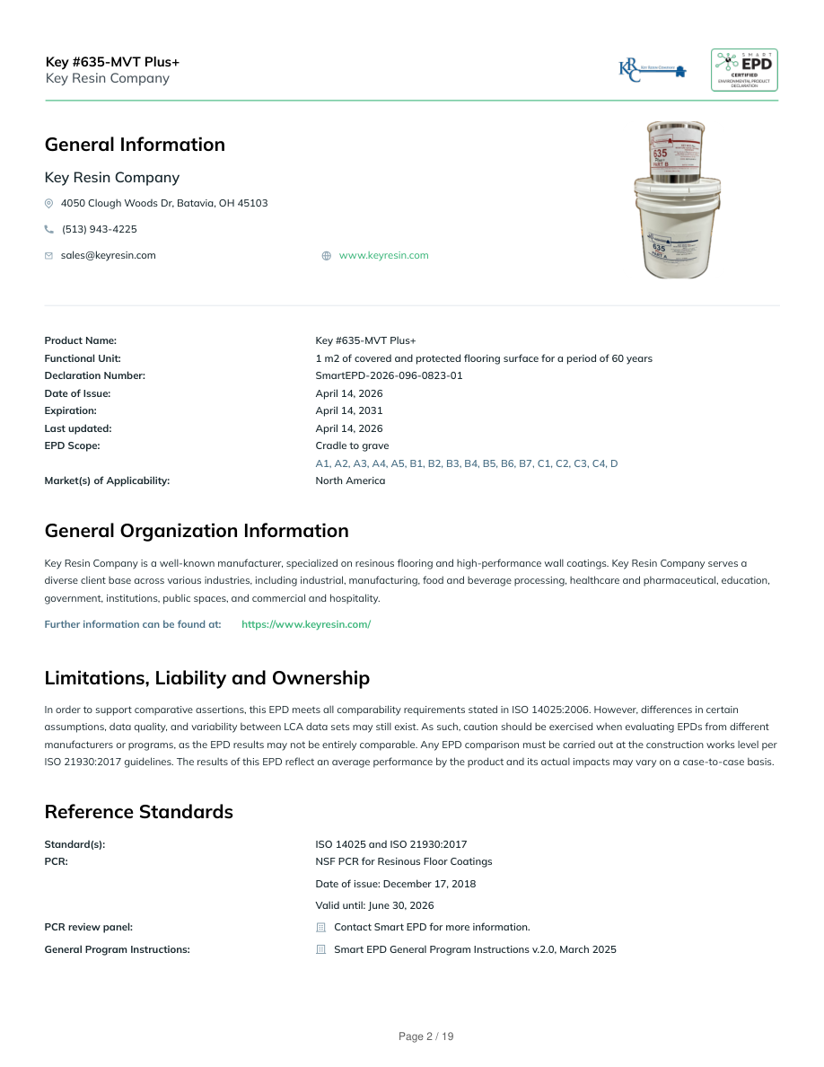 General InformationKey Resin Company4050 Clough Woods Dr, Batavia, OH 45103(513) 943-4225sales@keyresin.comwww.keyresin.comProduct Name:Key #635-MVT Plus+Functional Unit:1 m2 of covered and protected flooring surface for a period of 60 yearsDeclaration Number:SmartEPD-2026-096-0823-01Date of Issue:April 14, 2026Expiration:April 14, 2031Last updated:April 14, 2026EPD Scope:Cradle to graveA1, A2, A3, A4, A5, B1, B2, B3, B4, B5, B6, B7, C1, C2, C3, C4, DMarket(s) of Applicability:North AmericaGeneral Organization InformationKey Resin Company is a well-known manufacturer, specialized on resinous flooring and high-performance wall coatings. Key Resin Company serves adiverse client base across various industries, including industrial, manufacturing, food and beverage processing, healthcare and pharmaceutical, education,government, institutions, public spaces, and commercial and hospitality.Further information can be found at:https://www.keyresin.com/Limitations, Liability and OwnershipIn order to support comparative assertions, this EPD meets all comparability requirements stated in ISO 14025:2006. However, differences in certainassumptions, data quality, and variability between LCA data sets may still exist. As such, caution should be exercised when evaluating EPDs from differentmanufacturers or programs, as the EPD results may not be entirely comparable. Any EPD comparison must be carried out at the construction works level perISO 21930:2017 guidelines. The results of this EPD reflect an average performance by the product and its actual impacts may vary on a case-to-case basis.Reference StandardsStandard(s):ISO 14025 and ISO 21930:2017PCR:NSF PCR for Resinous Floor CoatingsDate of issue: December 17, 2018Valid until: June 30, 2026PCR review panel:Contact Smart EPD for more information.General Program Instructions:Smart EPD General Program Instructions v.2.0, March 2025Key #635-MVT Plus+Key Resin CompanyPage 2 / 19