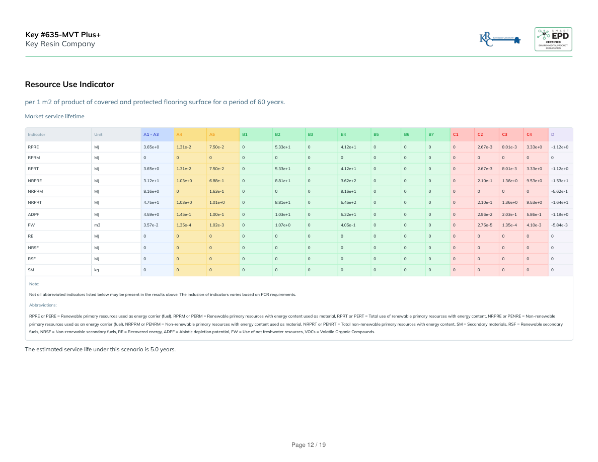 Resource Use Indicatorper 1 m2 of product of covered and protected flooring surface for a period of 60 years.Market service lifetimeIndicatorUnitA1 - A3A4A5B1B2B3B4B5B6B7C1C2C3C4DRPREMJ3.65e+01.31e-27.50e-205.33e+104.12e+100002.67e-38.01e-33.33e+0-1.12e+0RPRMMJ000000000000000RPRTMJ3.65e+01.31e-27.50e-205.33e+104.12e+100002.67e-38.01e-33.33e+0-1.12e+0NRPREMJ3.12e+11.03e+06.88e-108.81e+103.62e+200002.10e-11.36e+09.53e+0-1.53e+1NRPRMMJ8.16e+001.63e-10009.16e+10000000-5.62e-1NRPRTMJ4.75e+11.03e+01.01e+008.81e+105.45e+200002.10e-11.36e+09.53e+0-1.64e+1ADPFMJ4.59e+01.45e-11.00e-101.03e+105.32e+100002.96e-22.03e-15.86e-1-1.19e+0FWm33.57e-21.35e-41.02e-301.07e+004.05e-100002.75e-51.35e-44.10e-3-5.84e-3REMJ000000000000000NRSFMJ000000000000000RSFMJ000000000000000SMkg000000000000000Note:Not all abbreviated indicators listed below may be present in the results above. The inclusion of indicators varies based on PCR requirements.Abbreviations:RPRE or PERE = Renewable primary resources used as energy carrier (fuel), RPRM or PERM = Renewable primary resources with energy content used as material, RPRT or PERT = Total use of renewable primary resources with energy content, NRPRE or PENRE = Non-renewableprimary resources used as an energy carrier (fuel), NRPRM or PENRM = Non-renewable primary resources with energy content used as material, NRPRT or PENRT = Total non-renewable primary resources with energy content, SM = Secondary materials, RSF = Renewable secondaryfuels, NRSF = Non-renewable secondary fuels, RE = Recovered energy, ADPF = Abiotic depletion potential, FW = Use of net freshwater resources, VOCs = Volatile Organic Compounds.The estimated service life under this scenario is 5.0 years. Key #635-MVT Plus+Key Resin CompanyPage 12 / 19