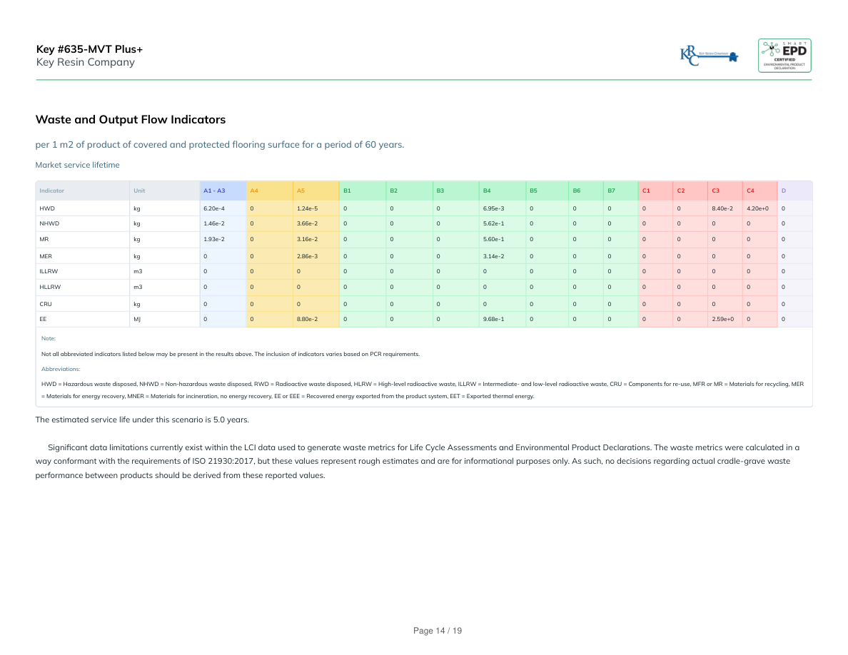 Waste and Output Flow Indicatorsper 1 m2 of product of covered and protected flooring surface for a period of 60 years.Market service lifetimeIndicatorUnitA1 - A3A4A5B1B2B3B4B5B6B7C1C2C3C4DHWDkg6.20e-401.24e-50006.95e-3000008.40e-24.20e+00NHWDkg1.46e-203.66e-20005.62e-100000000MRkg1.93e-203.16e-20005.60e-100000000MERkg002.86e-30003.14e-200000000ILLRWm3000000000000000HLLRWm3000000000000000CRUkg000000000000000EEMJ008.80e-20009.68e-1000002.59e+000Note:Not all abbreviated indicators listed below may be present in the results above. The inclusion of indicators varies based on PCR requirements.Abbreviations:HWD = Hazardous waste disposed, NHWD = Non-hazardous waste disposed, RWD = Radioactive waste disposed, HLRW = High-level radioactive waste, ILLRW = Intermediate- and low-level radioactive waste, CRU = Components for re-use, MFR or MR = Materials for recycling, MER= Materials for energy recovery, MNER = Materials for incineration, no energy recovery, EE or EEE = Recovered energy exported from the product system, EET = Exported thermal energy.The estimated service life under this scenario is 5.0 years. Significant data limitations currently exist within the LCI data used to generate waste metrics for Life Cycle Assessments and Environmental Product Declarations. The waste metrics were calculated in a way conformant with the requirements of ISO 21930:2017, but these values represent rough estimates and are for informational purposes only. As such, no decisions regarding actual cradle-grave waste performance between products should be derived from these reported values.Key #635-MVT Plus+Key Resin CompanyPage 14 / 19