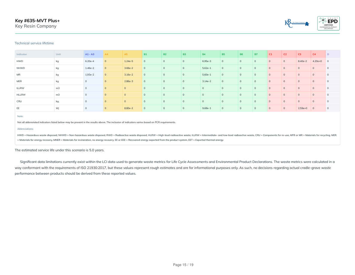 Technical service lifetimeIndicatorUnitA1 - A3A4A5B1B2B3B4B5B6B7C1C2C3C4DHWDkg6.20e-401.24e-50006.95e-3000008.40e-24.20e+00NHWDkg1.46e-203.66e-20005.62e-100000000MRkg1.93e-203.16e-20005.60e-100000000MERkg002.86e-30003.14e-200000000ILLRWm3000000000000000HLLRWm3000000000000000CRUkg000000000000000EEMJ008.80e-20009.68e-1000002.59e+000Note:Not all abbreviated indicators listed below may be present in the results above. The inclusion of indicators varies based on PCR requirements.Abbreviations:HWD = Hazardous waste disposed, NHWD = Non-hazardous waste disposed, RWD = Radioactive waste disposed, HLRW = High-level radioactive waste, ILLRW = Intermediate- and low-level radioactive waste, CRU = Components for re-use, MFR or MR = Materials for recycling, MER= Materials for energy recovery, MNER = Materials for incineration, no energy recovery, EE or EEE = Recovered energy exported from the product system, EET = Exported thermal energy.The estimated service life under this scenario is 5.0 years. Significant data limitations currently exist within the LCI data used to generate waste metrics for Life Cycle Assessments and Environmental Product Declarations. The waste metrics were calculated in a way conformant with the requirements of ISO 21930:2017, but these values represent rough estimates and are for informational purposes only. As such, no decisions regarding actual cradle-grave waste performance between products should be derived from these reported values.Key #635-MVT Plus+Key Resin CompanyPage 15 / 19