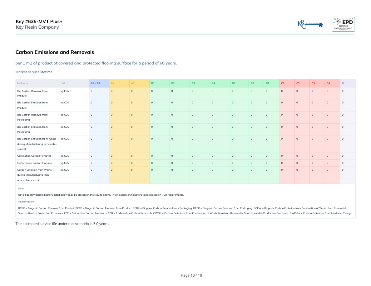 Carbon Emissions and Removalsper 1 m2 of product of covered and protected flooring surface for a period of 60 years.Market service lifetimeIndicatorUnitA1 - A3A4A5B1B2B3B4B5B6B7C1C2C3C4DBio Carbon Removal fromProductkg CO2000000000000000Bio Carbon Emission fromProductkg CO2000000000000000Bio Carbon Removal fromPackagingkg CO2000000000000000Bio Carbon Emission fromPackagingkg CO2000000000000000Bio Carbon Emission from Wasteduring Manufacturing (renewablesource)kg CO2000000000000000Calcination Carbon Removalkg CO2000000000000000Carbonation Carbon Emissionkg CO2000000000000000Carbon Emission from Wasteduring Manufacturing (non-renewable source)kg CO2000000000000000Note:Not all abbreviated indicators listed below may be present in the results above. The inclusion of indicators varies based on PCR requirements.Abbreviations:BCRP = Biogenic Carbon Removal from Product, BCEP = Biogenic Carbon Emission from Product, BCRK = Biogenic Carbon Removal from Packaging, BCEK = Biogenic Carbon Emission from Packaging, BCEW = Biogenic Carbon Emission from Combustion of Waste from RenewableSources Used in Production Processes, CCE = Calcination Carbon Emissions, CCR = Carbonation Carbon Removals, CWNR = Carbon Emissions from Combustion of Waste from Non-Renewable Sources used in Production Processes, GWP-luc = Carbon Emissions from Land-use Change.The estimated service life under this scenario is 5.0 years. Key #635-MVT Plus+Key Resin CompanyPage 16 / 19