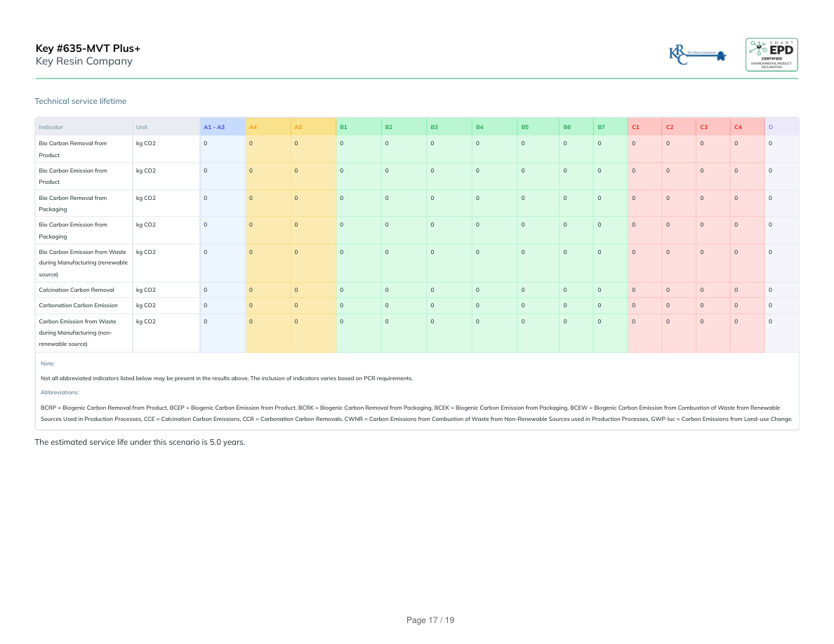 Technical service lifetimeIndicatorUnitA1 - A3A4A5B1B2B3B4B5B6B7C1C2C3C4DBio Carbon Removal fromProductkg CO2000000000000000Bio Carbon Emission fromProductkg CO2000000000000000Bio Carbon Removal fromPackagingkg CO2000000000000000Bio Carbon Emission fromPackagingkg CO2000000000000000Bio Carbon Emission from Wasteduring Manufacturing (renewablesource)kg CO2000000000000000Calcination Carbon Removalkg CO2000000000000000Carbonation Carbon Emissionkg CO2000000000000000Carbon Emission from Wasteduring Manufacturing (non-renewable source)kg CO2000000000000000Note:Not all abbreviated indicators listed below may be present in the results above. The inclusion of indicators varies based on PCR requirements.Abbreviations:BCRP = Biogenic Carbon Removal from Product, BCEP = Biogenic Carbon Emission from Product, BCRK = Biogenic Carbon Removal from Packaging, BCEK = Biogenic Carbon Emission from Packaging, BCEW = Biogenic Carbon Emission from Combustion of Waste from RenewableSources Used in Production Processes, CCE = Calcination Carbon Emissions, CCR = Carbonation Carbon Removals, CWNR = Carbon Emissions from Combustion of Waste from Non-Renewable Sources used in Production Processes, GWP-luc = Carbon Emissions from Land-use Change.The estimated service life under this scenario is 5.0 years. Key #635-MVT Plus+Key Resin CompanyPage 17 / 19