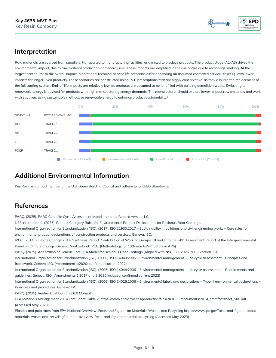 InterpretationRaw materials are sourced from suppliers, transported to manufacturing facilities, and mixed to produce products. The product stage (A1-A3) drives theenvironmental impact, due to raw material production and energy use. These impacts are amplified in the use phase due to recoatings, making B4 thelargest contributor to the overall impact. Market and Technical service life scenarios differ depending on assumed estimated service life (ESL), with lowerimpacts for longer-lived products. Those scenarios are constructed using PCR prescriptions that are highly conservative, as they assume the replacement ofthe full coating system. End-of-life impacts are relatively low, as products are assumed to be landfilled with building demolition waste. Switching torenewable energy is advised for products with high manufacturing energy demands. The manufacturer should explore lower-impact raw materials and workwith suppliers using sustainable methods or renewable energy to enhance product sustainability.\0%20%40%60%80%100%GWP-TotalIPCC AR5 GWP 100ODPTRACI 2.1APTRACI 2.1EPTRACI 2.1POCPTRACI 2.1Production (A1 - A3)Construction (A4 - A5)Use (B1 - B7)End of Life (C1 - C4)Additional Environmental InformationKey Resin is a proud member of the U.S. Green Building Council and adhere to its LEED Standards.ReferencesPARQ. (2025). PARQ Core Life Cycle Assessment Model – Internal Report: Version 1.0.NSF International. (2025). Product Category Rules for Environmental Product Declarations for Resinous Floor Coatings.International Organization for Standardization (ISO). (2017). ISO 21930:2017 – Sustainability in buildings and civil engineering works – Core rules forenvironmental product declarations of construction products and services. Geneva: ISO.IPCC. (2014). Climate Change 2014: Synthesis Report. Contribution of Working Groups I, II and III to the Fifth Assessment Report of the IntergovernmentalPanel on Climate Change. Geneva, Switzerland: IPCC. (Methodology for 100-year GWP factors in AR5)PARQ. (2025). Adaptation of Generic Core LCA Model for Resinous Floor Coatings (Aligned with NSF 111-2025 PCR): Version 1.0.International Organization for Standardization (ISO). (2006). ISO 14040:2006 – Environmental management – Life cycle assessment – Principles andframework. Geneva: ISO. (Amendment 1:2020; confirmed current 2022)International Organization for Standardization (ISO). (2006). ISO 14044:2006 – Environmental management – Life cycle assessment – Requirements andguidelines. Geneva: ISO. (Amendments 1:2017 and 2:2020 included; confirmed current 2022)International Organization for Standardization (ISO). (2006). ISO 14025:2006 – Environmental labels and declarations – Type III environmental declarations –Principles and procedures. Geneva: ISOPARQ. (2025). Verifier Dashboard v3.0.0 Manual.EPA Materials Management 2014 Fact Sheet, Table 2: https://www.epa.gov/sites/production/files/2016-11/documents/2014_smmfactsheet_508.pdf(Accessed May 2023)Plastics and pulp rates from EPA National Overview: Facts and Figures on Materials, Wastes and Recycling https://www.epa.gov/facts-and-figures-about-materials-waste-and-recycling/national-overview-facts-and-figures-materials#recycling (Accessed May 2023)Key #635-MVT Plus+Key Resin CompanyPage 18 / 19