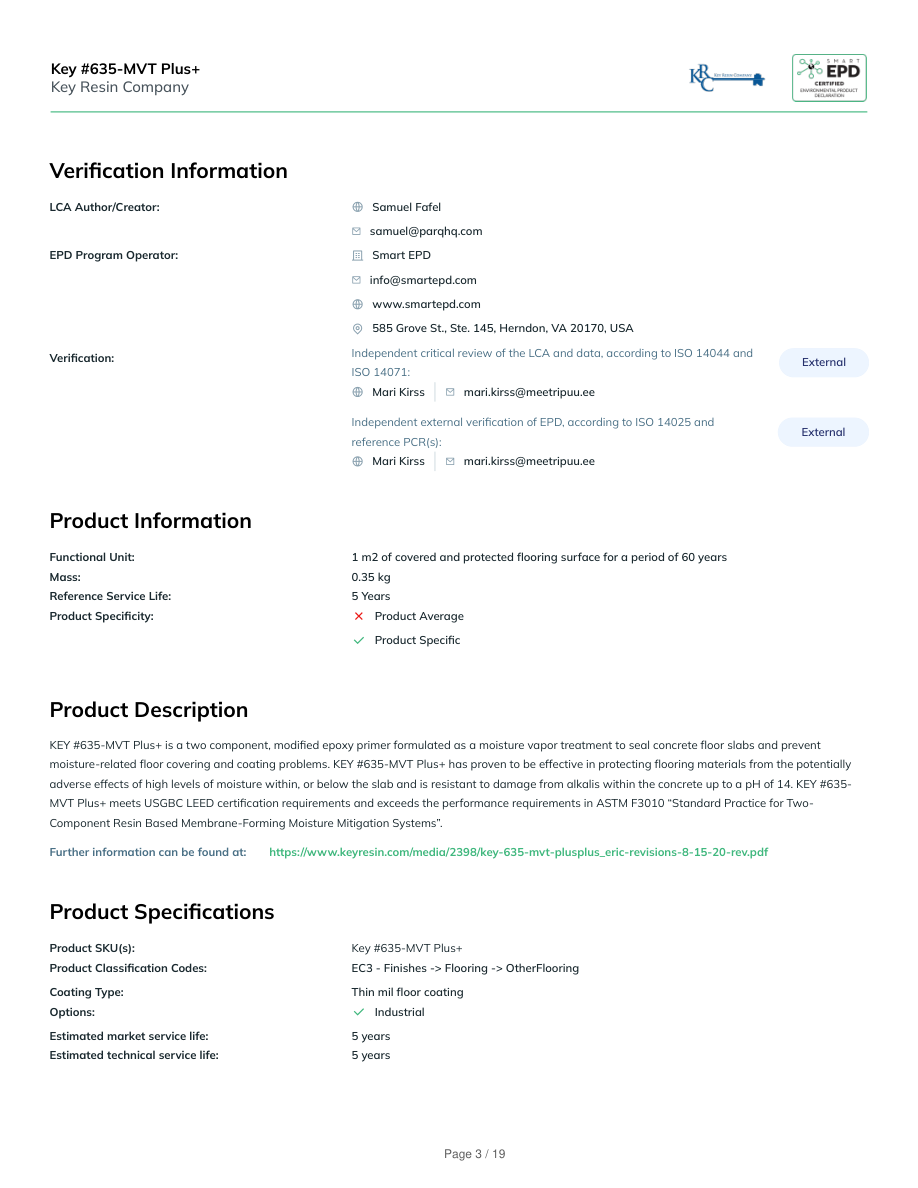 Verification InformationLCA Author/Creator:Samuel Fafelsamuel@parqhq.comEPD Program Operator:Smart EPDinfo@smartepd.comwww.smartepd.com585 Grove St., Ste. 145, Herndon, VA 20170, USAVerification:Independent critical review of the LCA and data, according to ISO 14044 andISO 14071:ExternalMari Kirssmari.kirss@meetripuu.eeIndependent external verification of EPD, according to ISO 14025 andreference PCR(s):ExternalMari Kirssmari.kirss@meetripuu.eeProduct InformationFunctional Unit:1 m2 of covered and protected flooring surface for a period of 60 yearsMass:0.35 kgReference Service Life:5 YearsProduct Specificity:Product AverageProduct SpecificProduct DescriptionKEY #635-MVT Plus+ is a two component, modified epoxy primer formulated as a moisture vapor treatment to seal concrete floor slabs and preventmoisture-related floor covering and coating problems. KEY #635-MVT Plus+ has proven to be effective in protecting flooring materials from the potentiallyadverse effects of high levels of moisture within, or below the slab and is resistant to damage from alkalis within the concrete up to a pH of 14. KEY #635-MVT Plus+ meets USGBC LEED certification requirements and exceeds the performance requirements in ASTM F3010 “Standard Practice for Two-Component Resin Based Membrane-Forming Moisture Mitigation Systems”.Further information can be found at:https://www.keyresin.com/media/2398/key-635-mvt-plusplus_eric-revisions-8-15-20-rev.pdfProduct SpecificationsProduct SKU(s):Key #635-MVT Plus+Product Classification Codes:EC3 - Finishes -> Flooring -> OtherFlooringCoating Type:Thin mil floor coatingOptions:IndustrialEstimated market service life:5 yearsEstimated technical service life:5 yearsKey #635-MVT Plus+Key Resin CompanyPage 3 / 19