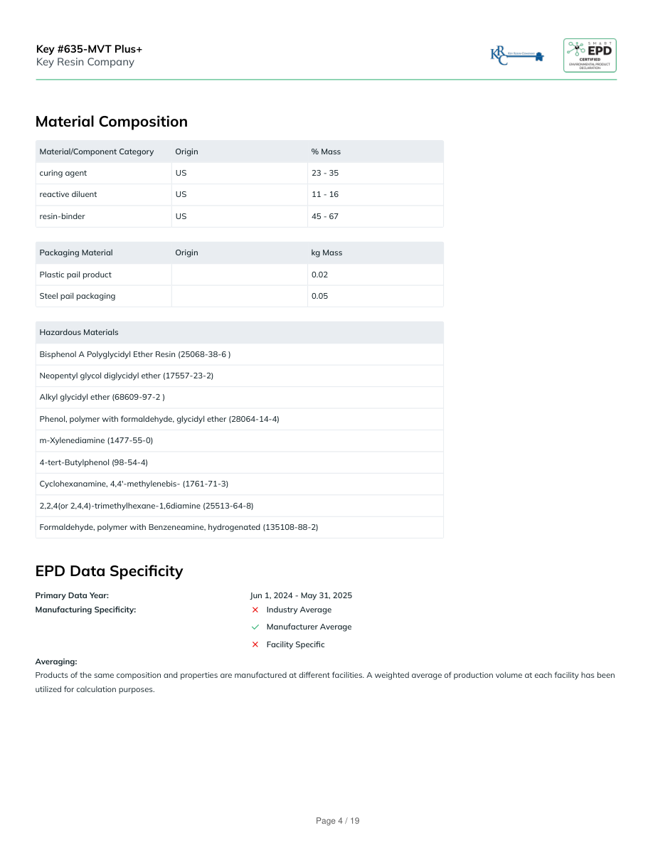 Material CompositionMaterial/Component CategoryOrigin% Masscuring agentUS23 - 35reactive diluentUS11 - 16resin-binderUS45 - 67Packaging MaterialOriginkg MassPlastic pail product0.02Steel pail packaging0.05Hazardous MaterialsBisphenol A Polyglycidyl Ether Resin (25068-38-6 )Neopentyl glycol diglycidyl ether (17557-23-2)Alkyl glycidyl ether (68609-97-2 )Phenol, polymer with formaldehyde, glycidyl ether (28064-14-4)m-Xylenediamine (1477-55-0)4-tert-Butylphenol (98-54-4)Cyclohexanamine, 4,4'-methylenebis- (1761-71-3)2,2,4(or 2,4,4)-trimethylhexane-1,6diamine (25513-64-8)Formaldehyde, polymer with Benzeneamine, hydrogenated (135108-88-2)EPD Data SpecificityPrimary Data Year:Jun 1, 2024 - May 31, 2025Manufacturing Specificity:Industry AverageManufacturer AverageFacility SpecificAveraging:Products of the same composition and properties are manufactured at different facilities. A weighted average of production volume at each facility has beenutilized for calculation purposes.Key #635-MVT Plus+Key Resin CompanyPage 4 / 19