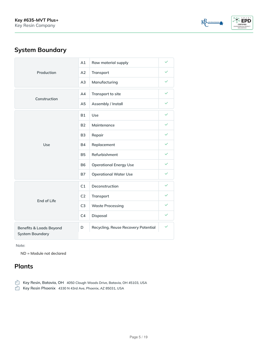 System BoundaryProductionA1Raw material supplyA2TransportA3ManufacturingConstructionA4Transport to siteA5Assembly / InstallUseB1UseB2MaintenanceB3RepairB4ReplacementB5RefurbishmentB6Operational Energy UseB7Operational Water UseEnd of LifeC1DeconstructionC2TransportC3Waste ProcessingC4DisposalBenefits & Loads BeyondSystem BoundaryDRecycling, Reuse Recovery PotentialNote:ND = Module not declaredPlantsKey Resin, Batavia, OH4050 Clough Woods Drive, Batavia, OH 45103, USAKey Resin Phoenix4330 N 43rd Ave, Phoenix, AZ 85031, USAKey #635-MVT Plus+Key Resin CompanyPage 5 / 19