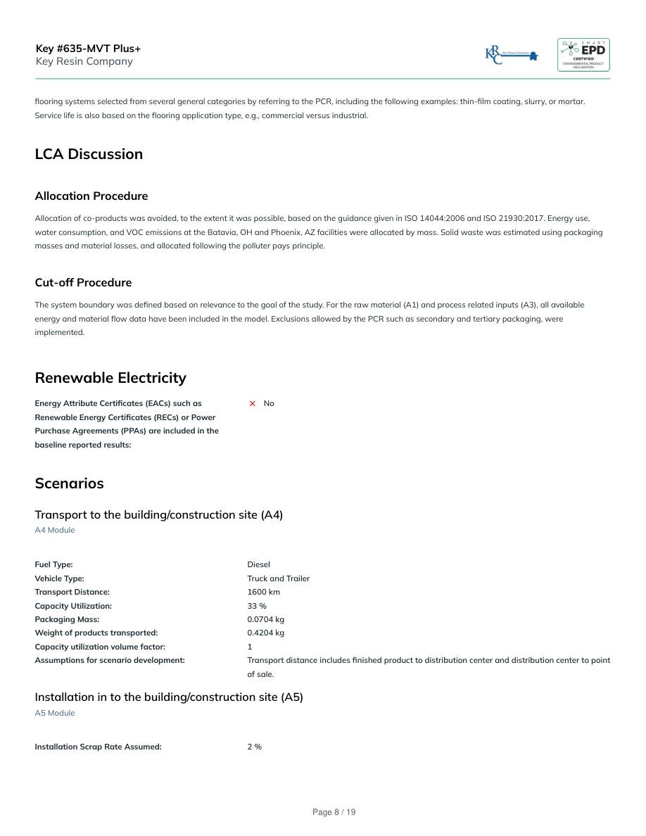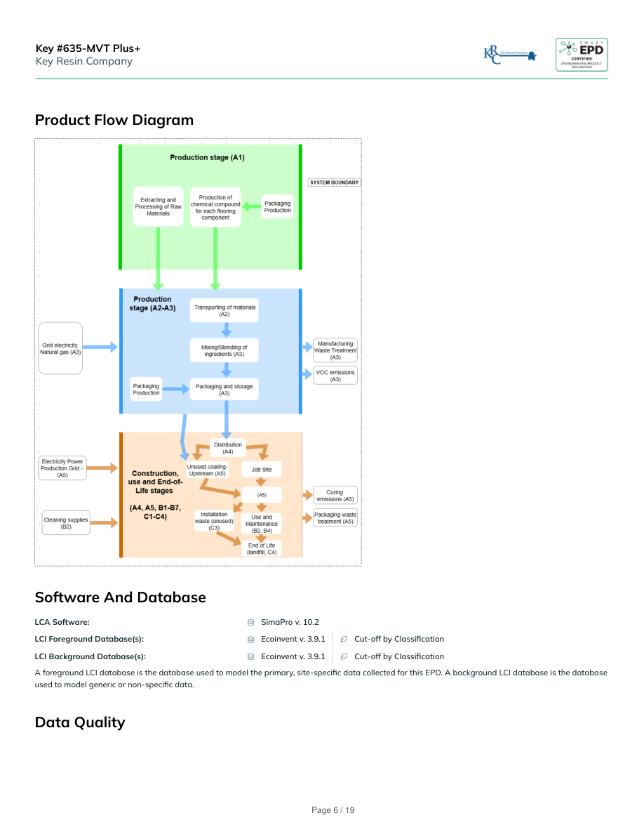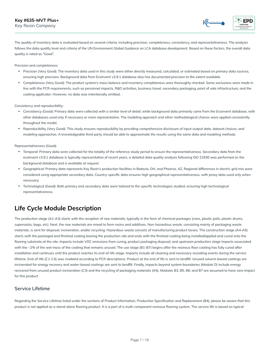 The quality of inventory data is evaluated based on several criteria, including precision, completeness, consistency, and representativeness. The analysisfollows the data quality level and criteria of the UN Environment Global Guidance on LCA database development. Based on these factors, the overall dataquality is rated as "Good”.Precision and completeness:Precision (Very Good): The inventory data used in this study were either directly measured, calculated, or estimated based on primary data sources,ensuring high precision. Background data from Ecoinvent v3.9.1 database also has documented precision to the extent available.Completeness (Very Good): The product system's mass balance and inventory completeness were thoroughly checked. Some exclusions were made inline with the PCR requirements, such as personnel impacts, R&D activities, business travel, secondary packaging, point of sale infrastructure, and thecoating applicator. However, no data was intentionally omitted.Consistency and reproducibility:Consistency (Good): Primary data were collected with a similar level of detail, while background data primarily came from the Ecoinvent database, withother databases used only if necessary or more representative. The modeling approach and other methodological choices were applied consistentlythroughout the model.Reproducibility (Very Good): This study ensures reproducibility by providing comprehensive disclosure of input-output data, dataset choices, andmodeling approaches. A knowledgeable third party should be able to approximate the results using the same data and modeling methods.Representativeness (Good):Temporal: Primary data were collected for the totality of the reference study period to ensure the representativeness. Secondary data from theecoinvent v3.9.1 database is typically representative of recent years, a detailed data quality analysis following ISO 21930 was performed on thebackground database and is available at request.Geographical: Primary data represents Key Resin's production facilities in Batavia, OH, and Phoenix, AZ. Regional differences in electric grid mix wereconsidered using appropriate secondary data. Country-specific data ensures high geographical representativeness, with proxy data used only whennecessary.Technological (Good): Both primary and secondary data were tailored to the specific technologies studied, ensuring high technologicalrepresentativeness.Life Cycle Module DescriptionThe production stage (A1-A3) starts with the reception of raw materials, typically in the form of chemical packages (cans, plastic pails, plastic drums,supersacks, bags, etc). Next, the raw materials are mixed to form resins and additives. Non-hazardous waste, consisting mainly of packaging wastematerials, is sent for disposal, incineration, and/or recycling. Hazardous waste consists of manufacturing product losses. The construction stage (A4-A5)starts with the packaged and finished coating leaving the production site and ends with the finished coating being installed/applied and cured onto theflooring substrate at the site. Impacts include VOC emissions from curing, product packaging disposal, and upstream production stage impacts associatedwith the ~2% of the wet mass of the coating that remains unused. The use stage (B1-B7) begins after the resinous floor coating has fully cured afterinstallation and continues until the product reaches its end-of-life stage. Impacts include all cleaning and necessary recoating events during the servicelifetime. End-of-life (C1-C4) was modeled according to PCR descriptions. Product at the end of life is sent to landfill. Unused solvent-based coatings areincinerated for energy recovery and water-based coatings are sent to landfill. Finally, impacts beyond system boundaries (Module D) include energyrecivered from unused product incineration (C3) and the recycling of packaging materials (A5). Modules B3, B5, B6, and B7 are assumed to have zero impactfor this product.Service LifetimeRegarding the Service Lifetime listed under the sections of Product Information, Production Specification and Replacement (B4), please be aware that thisproduct is not applied as a stand-alone flooring product. It is a part of a multi-component resinous flooring system. The service life is based on typicalKey #635-MVT Plus+Key Resin CompanyPage 7 / 19