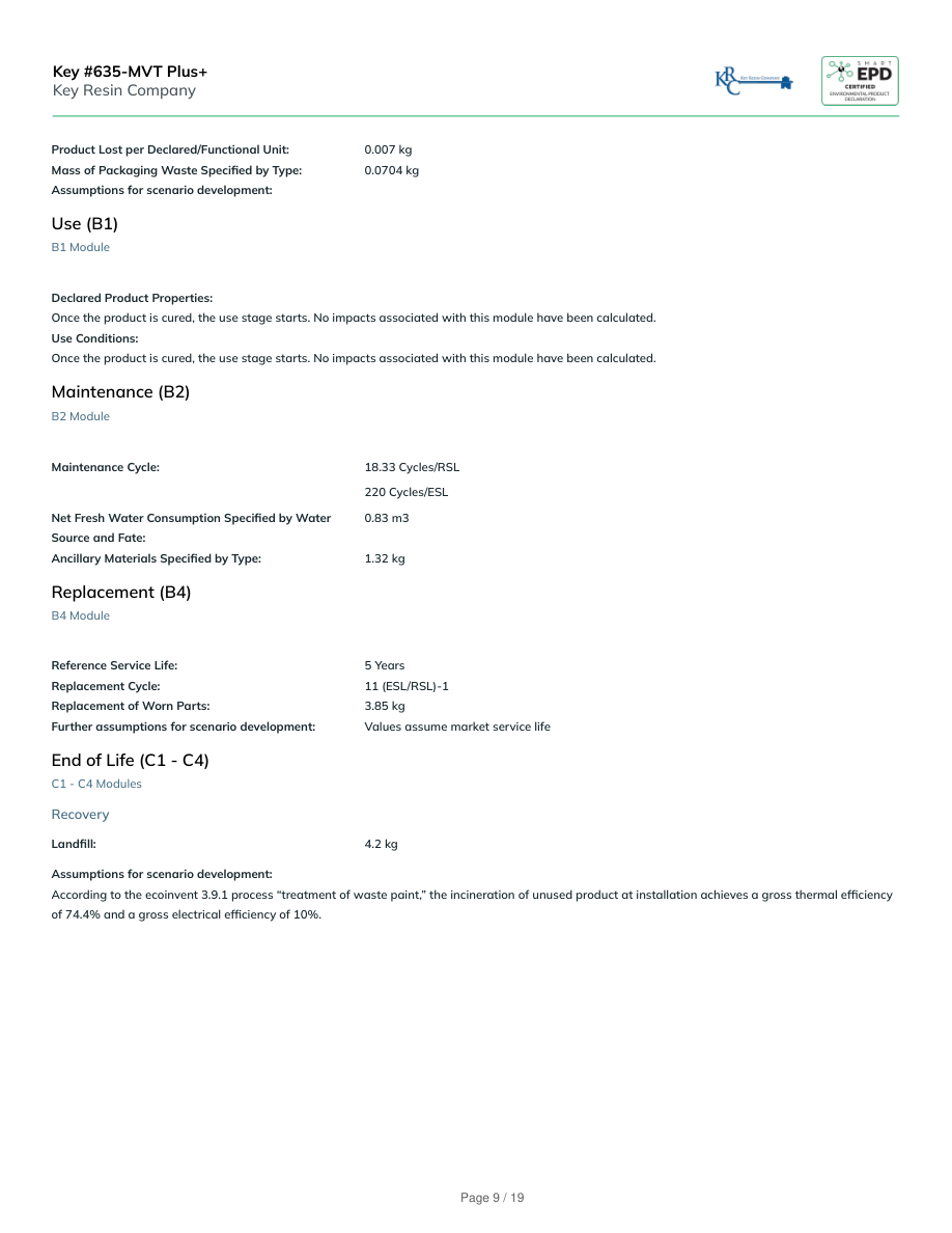 Product Lost per Declared/Functional Unit:0.007 kgMass of Packaging Waste Specified by Type:0.0704 kgAssumptions for scenario development:Use (B1)B1 ModuleDeclared Product Properties:Once the product is cured, the use stage starts. No impacts associated with this module have been calculated.Use Conditions:Once the product is cured, the use stage starts. No impacts associated with this module have been calculated.Maintenance (B2)B2 ModuleMaintenance Cycle:18.33 Cycles/RSL220 Cycles/ESLNet Fresh Water Consumption Specified by WaterSource and Fate:0.83 m3Ancillary Materials Specified by Type:1.32 kgReplacement (B4)B4 ModuleReference Service Life:5 YearsReplacement Cycle:11 (ESL/RSL)-1Replacement of Worn Parts:3.85 kgFurther assumptions for scenario development:Values assume market service lifeEnd of Life (C1 - C4)C1 - C4 ModulesRecoveryLandfill:4.2 kgAssumptions for scenario development:According to the ecoinvent 3.9.1 process “treatment of waste paint,” the incineration of unused product at installation achieves a gross thermal efficiencyof 74.4% and a gross electrical efficiency of 10%.Key #635-MVT Plus+Key Resin CompanyPage 9 / 19