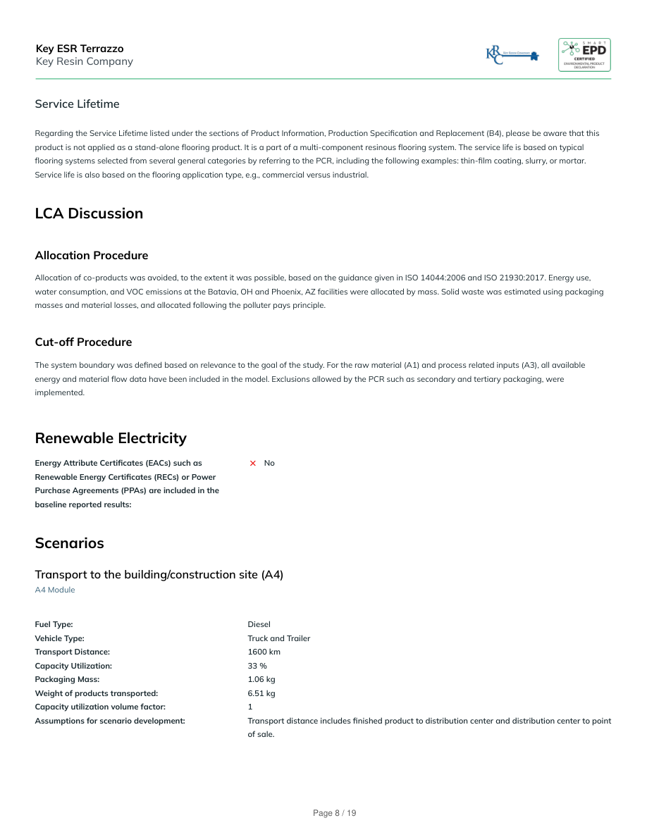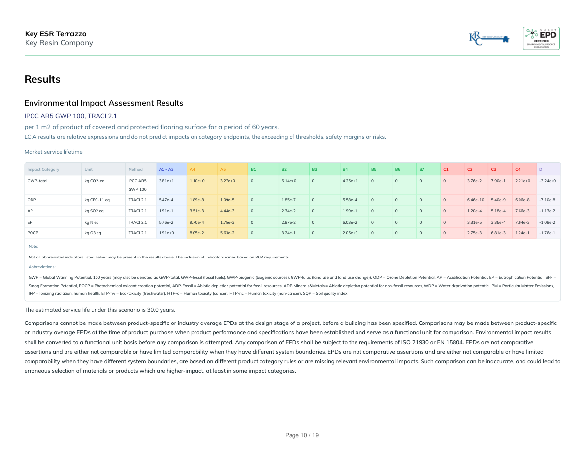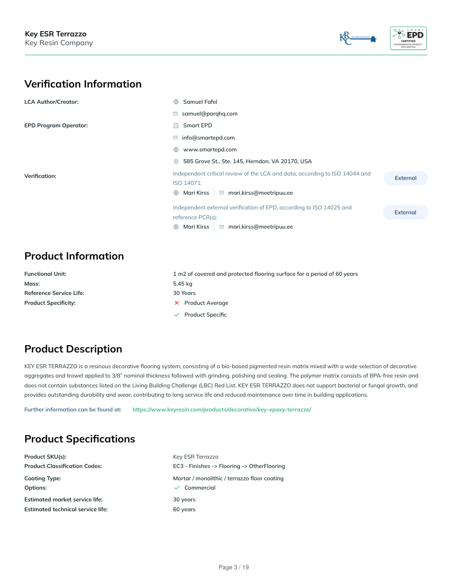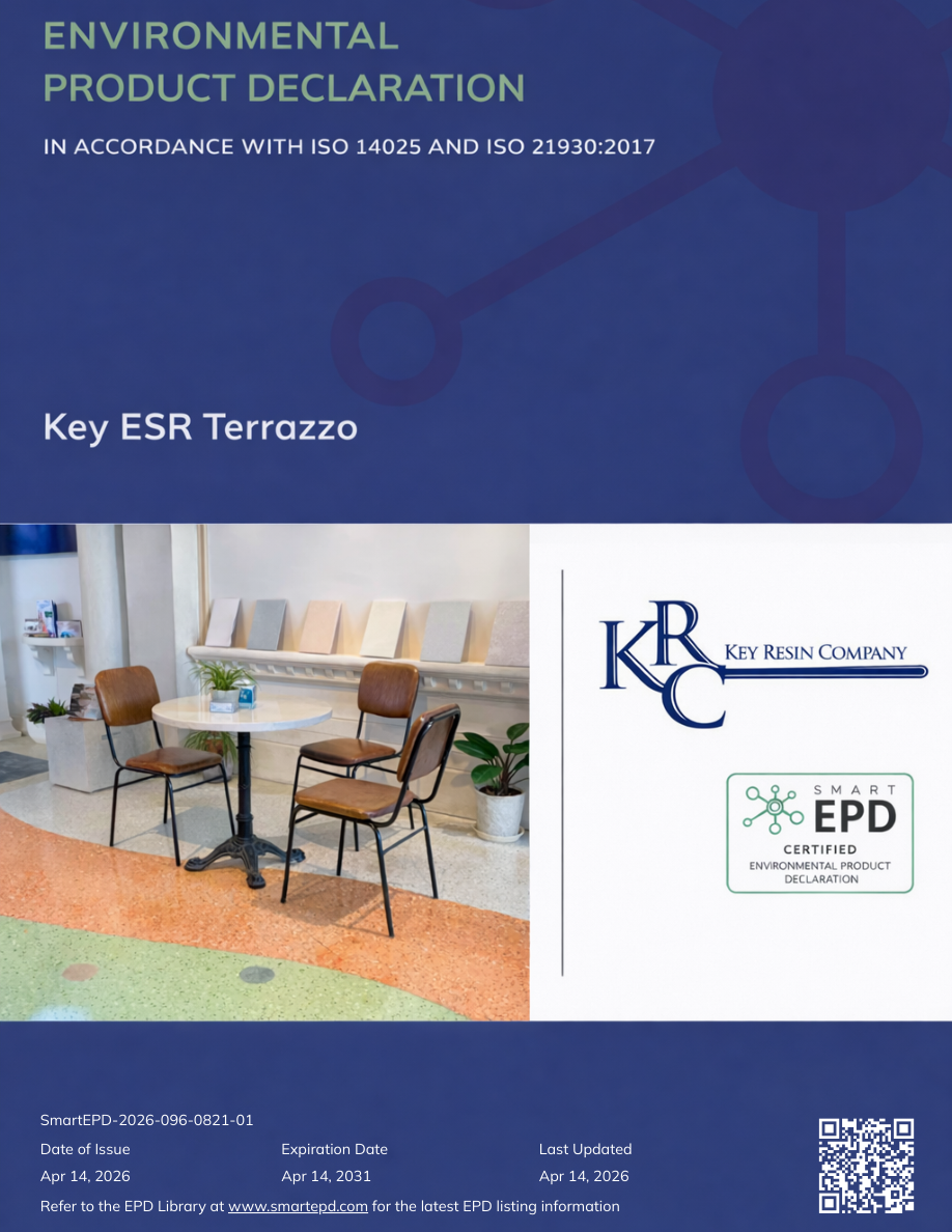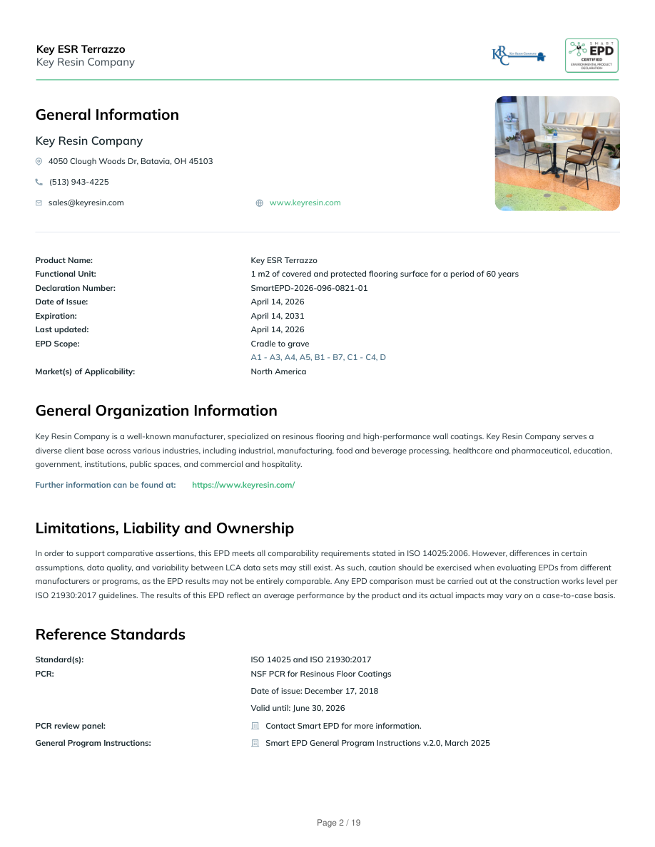 General InformationKey Resin Company4050 Clough Woods Dr, Batavia, OH 45103(513) 943-4225sales@keyresin.comwww.keyresin.comProduct Name:Key ESR TerrazzoFunctional Unit:1 m2 of covered and protected flooring surface for a period of 60 yearsDeclaration Number:SmartEPD-2026-096-0821-01Date of Issue:April 14, 2026Expiration:April 14, 2031Last updated:April 14, 2026EPD Scope:Cradle to graveA1 - A3, A4, A5, B1 - B7, C1 - C4, DMarket(s) of Applicability:North AmericaGeneral Organization InformationKey Resin Company is a well-known manufacturer, specialized on resinous flooring and high-performance wall coatings. Key Resin Company serves adiverse client base across various industries, including industrial, manufacturing, food and beverage processing, healthcare and pharmaceutical, education,government, institutions, public spaces, and commercial and hospitality.Further information can be found at:https://www.keyresin.com/Limitations, Liability and OwnershipIn order to support comparative assertions, this EPD meets all comparability requirements stated in ISO 14025:2006. However, differences in certainassumptions, data quality, and variability between LCA data sets may still exist. As such, caution should be exercised when evaluating EPDs from differentmanufacturers or programs, as the EPD results may not be entirely comparable. Any EPD comparison must be carried out at the construction works level perISO 21930:2017 guidelines. The results of this EPD reflect an average performance by the product and its actual impacts may vary on a case-to-case basis.Reference StandardsStandard(s):ISO 14025 and ISO 21930:2017PCR:NSF PCR for Resinous Floor CoatingsDate of issue: December 17, 2018Valid until: June 30, 2026PCR review panel:Contact Smart EPD for more information.General Program Instructions:Smart EPD General Program Instructions v.2.0, March 2025Key ESR TerrazzoKey Resin CompanyPage 2 / 19