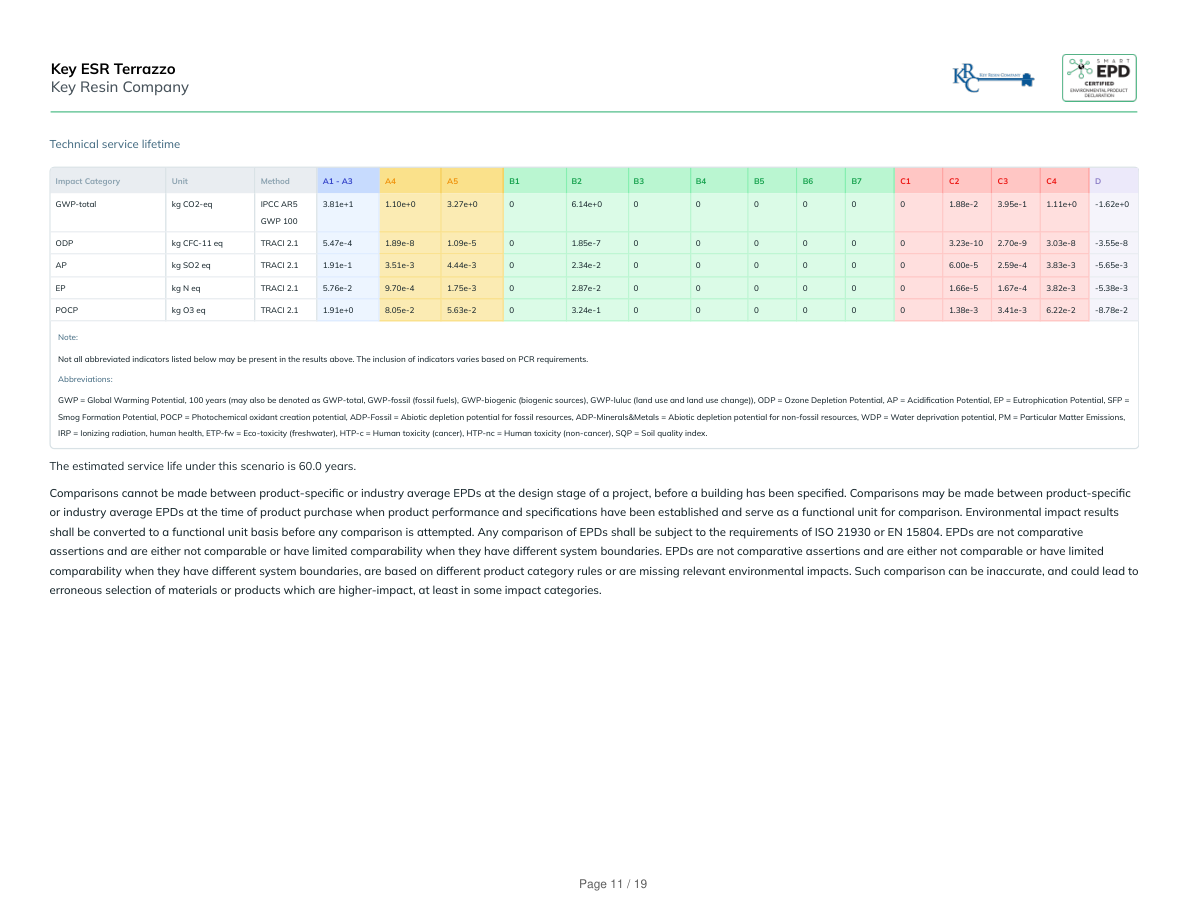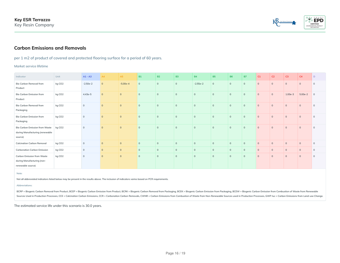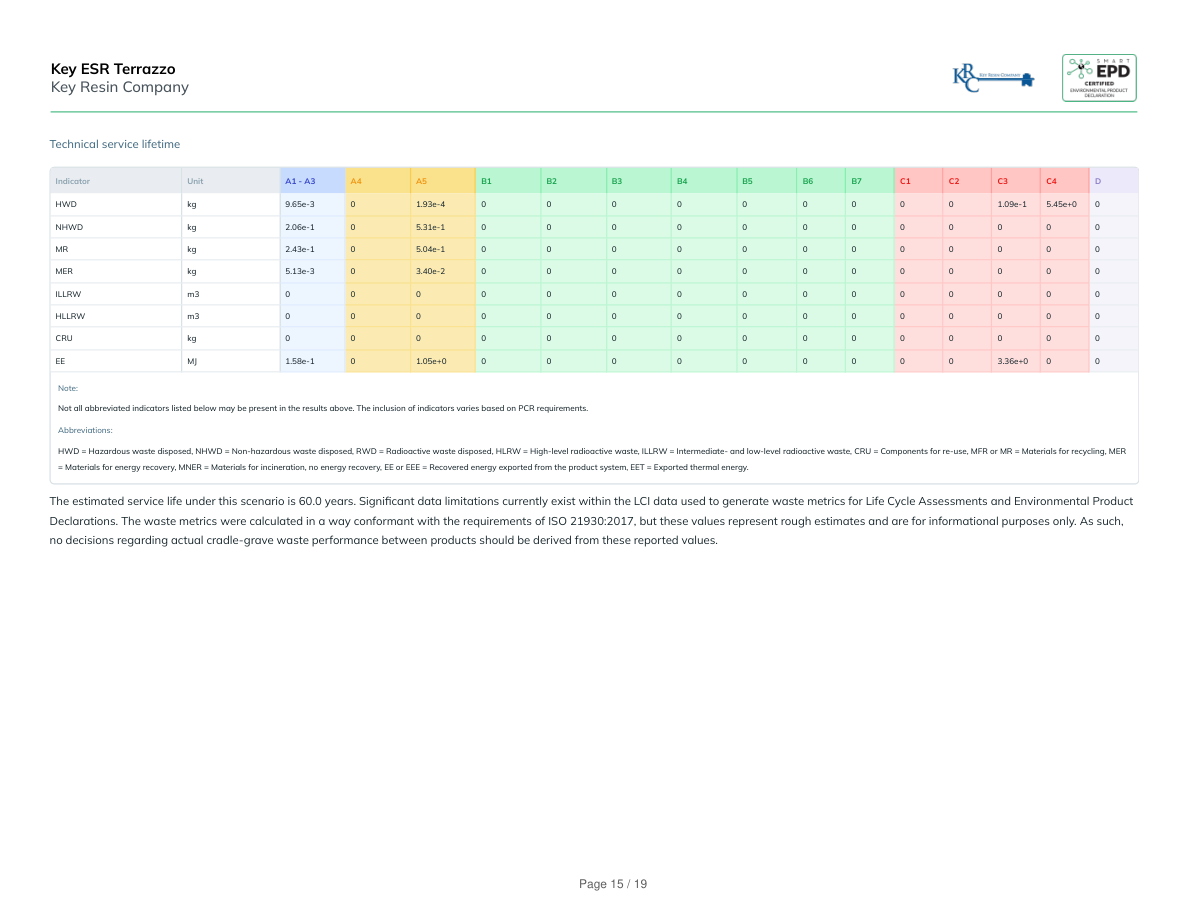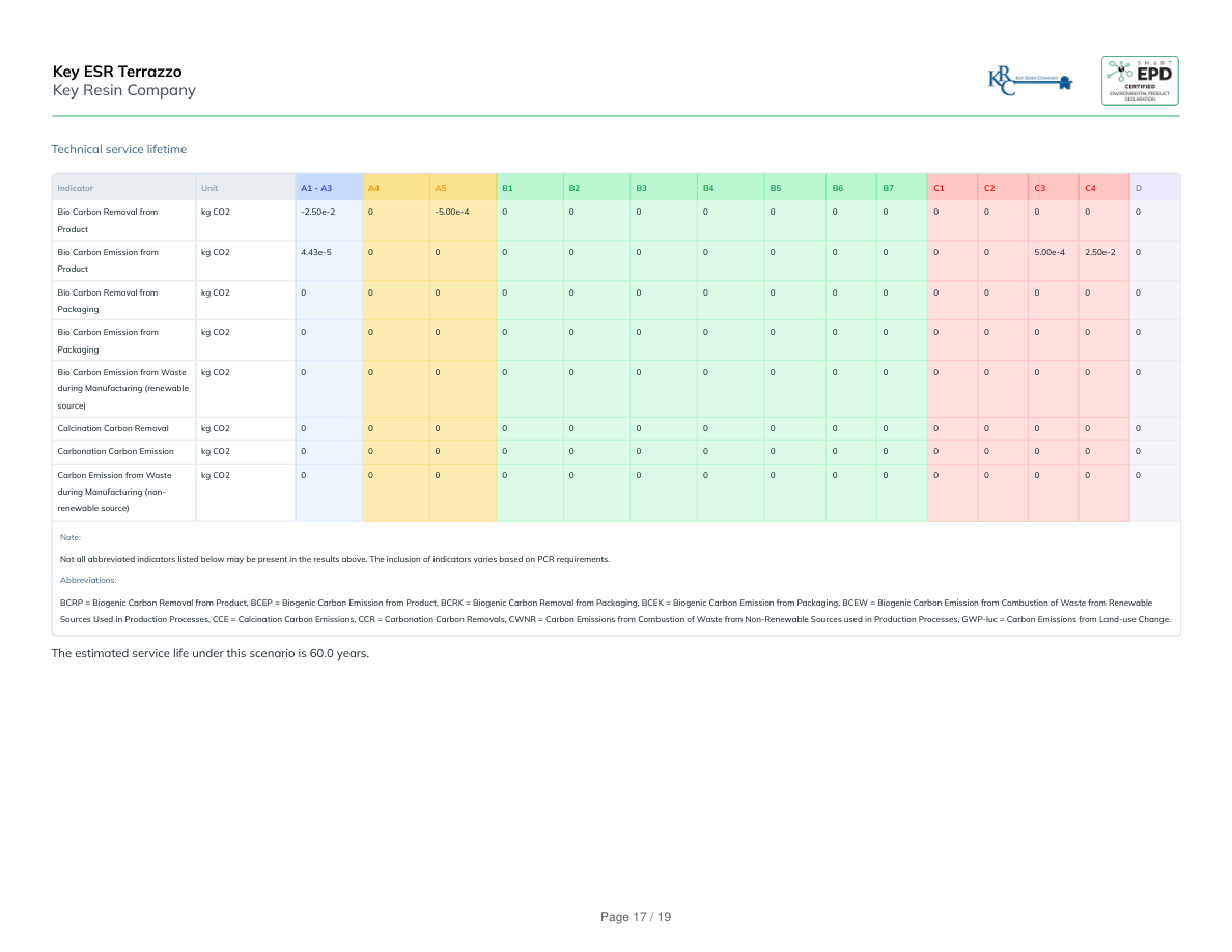 Technical service lifetimeIndicatorUnitA1 - A3A4A5B1B2B3B4B5B6B7C1C2C3C4DBio Carbon Removal fromProductkg CO2-2.50e-20-5.00e-4000000000000Bio Carbon Emission fromProductkg CO24.43e-5000000000005.00e-42.50e-20Bio Carbon Removal fromPackagingkg CO2000000000000000Bio Carbon Emission fromPackagingkg CO2000000000000000Bio Carbon Emission from Wasteduring Manufacturing (renewablesource)kg CO2000000000000000Calcination Carbon Removalkg CO2000000000000000Carbonation Carbon Emissionkg CO2000000000000000Carbon Emission from Wasteduring Manufacturing (non-renewable source)kg CO2000000000000000Note:Not all abbreviated indicators listed below may be present in the results above. The inclusion of indicators varies based on PCR requirements.Abbreviations:BCRP = Biogenic Carbon Removal from Product, BCEP = Biogenic Carbon Emission from Product, BCRK = Biogenic Carbon Removal from Packaging, BCEK = Biogenic Carbon Emission from Packaging, BCEW = Biogenic Carbon Emission from Combustion of Waste from RenewableSources Used in Production Processes, CCE = Calcination Carbon Emissions, CCR = Carbonation Carbon Removals, CWNR = Carbon Emissions from Combustion of Waste from Non-Renewable Sources used in Production Processes, GWP-luc = Carbon Emissions from Land-use Change.The estimated service life under this scenario is 60.0 years.Key ESR TerrazzoKey Resin CompanyPage 17 / 19