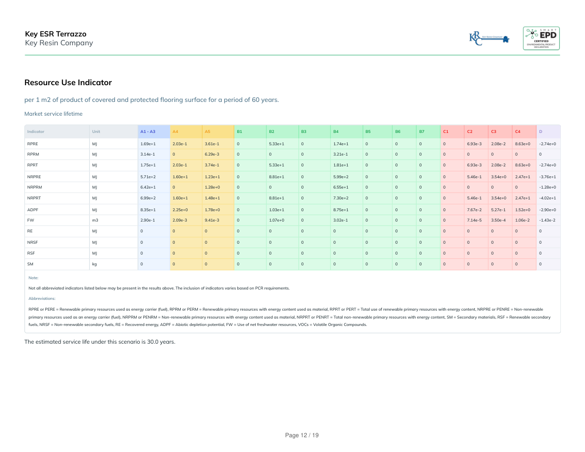 Technical service lifetimeIndicatorUnitA1 - A3A4A5B1B2B3B4B5B6B7C1C2C3C4DRPREMJ1.69e+12.03e-13.61e-105.33e+10000003.46e-31.04e-24.32e+0-1.37e+0RPRMMJ3.14e-106.29e-3000000000000RPRTMJ1.75e+12.03e-13.74e-105.33e+10000003.46e-31.04e-24.32e+0-1.37e+0NRPREMJ5.71e+21.60e+11.23e+108.81e+10000002.73e-11.77e+01.24e+1-1.88e+1NRPRMMJ6.42e+101.28e+000000000000-6.39e-1NRPRTMJ6.99e+21.60e+11.48e+108.81e+10000002.73e-11.77e+01.24e+1-2.01e+1ADPFMJ8.35e+12.25e+01.78e+001.03e+10000003.84e-22.64e-17.61e-1-1.45e+0FWm32.90e-12.09e-39.41e-301.07e+00000003.57e-51.75e-45.32e-3-7.17e-3REMJ000000000000000NRSFMJ000000000000000RSFMJ000000000000000SMkg000000000000000Note:Not all abbreviated indicators listed below may be present in the results above. The inclusion of indicators varies based on PCR requirements.Abbreviations:RPRE or PERE = Renewable primary resources used as energy carrier (fuel), RPRM or PERM = Renewable primary resources with energy content used as material, RPRT or PERT = Total use of renewable primary resources with energy content, NRPRE or PENRE = Non-renewableprimary resources used as an energy carrier (fuel), NRPRM or PENRM = Non-renewable primary resources with energy content used as material, NRPRT or PENRT = Total non-renewable primary resources with energy content, SM = Secondary materials, RSF = Renewable secondaryfuels, NRSF = Non-renewable secondary fuels, RE = Recovered energy, ADPF = Abiotic depletion potential, FW = Use of net freshwater resources, VOCs = Volatile Organic Compounds.The estimated service life under this scenario is 60.0 years. Key ESR TerrazzoKey Resin CompanyPage 13 / 19