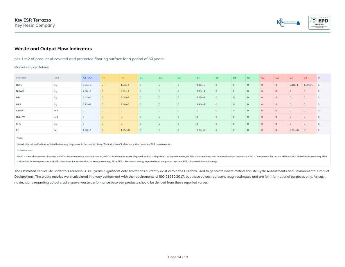 Waste and Output Flow Indicatorsper 1 m2 of product of covered and protected flooring surface for a period of 60 years.Market service lifetimeIndicatorUnitA1 - A3A4A5B1B2B3B4B5B6B7C1C2C3C4DHWDkg9.65e-301.93e-40009.84e-3000002.18e-11.09e+10NHWDkg2.06e-105.31e-10007.38e-100000000MRkg2.43e-105.04e-10007.47e-100000000MERkg5.13e-303.40e-20003.91e-200000000ILLRWm3000000000000000HLLRWm3000000000000000CRUkg000000000000000EEMJ1.58e-101.05e+00001.20e+0000006.71e+000Note:Not all abbreviated indicators listed below may be present in the results above. The inclusion of indicators varies based on PCR requirements.Abbreviations:HWD = Hazardous waste disposed, NHWD = Non-hazardous waste disposed, RWD = Radioactive waste disposed, HLRW = High-level radioactive waste, ILLRW = Intermediate- and low-level radioactive waste, CRU = Components for re-use, MFR or MR = Materials for recycling, MER= Materials for energy recovery, MNER = Materials for incineration, no energy recovery, EE or EEE = Recovered energy exported from the product system, EET = Exported thermal energy.The estimated service life under this scenario is 30.0 years. Significant data limitations currently exist within the LCI data used to generate waste metrics for Life Cycle Assessments and Environmental ProductDeclarations. The waste metrics were calculated in a way conformant with the requirements of ISO 21930:2017, but these values represent rough estimates and are for informational purposes only. As such,no decisions regarding actual cradle-grave waste performance between products should be derived from these reported values.Key ESR TerrazzoKey Resin CompanyPage 14 / 19