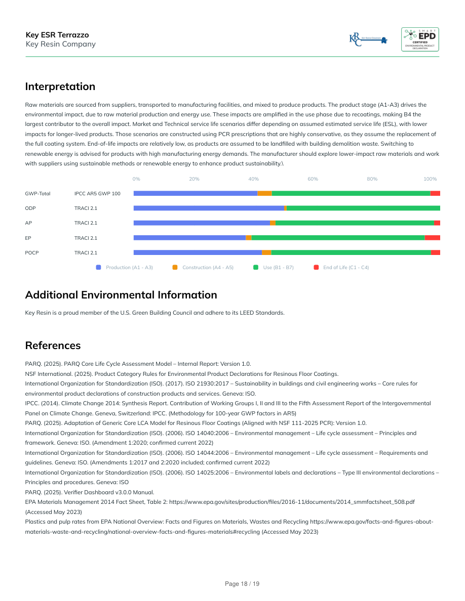 InterpretationRaw materials are sourced from suppliers, transported to manufacturing facilities, and mixed to produce products. The product stage (A1-A3) drives theenvironmental impact, due to raw material production and energy use. These impacts are amplified in the use phase due to recoatings, making B4 thelargest contributor to the overall impact. Market and Technical service life scenarios differ depending on assumed estimated service life (ESL), with lowerimpacts for longer-lived products. Those scenarios are constructed using PCR prescriptions that are highly conservative, as they assume the replacement ofthe full coating system. End-of-life impacts are relatively low, as products are assumed to be landfilled with building demolition waste. Switching torenewable energy is advised for products with high manufacturing energy demands. The manufacturer should explore lower-impact raw materials and workwith suppliers using sustainable methods or renewable energy to enhance product sustainability.\0%20%40%60%80%100%GWP-TotalIPCC AR5 GWP 100ODPTRACI 2.1APTRACI 2.1EPTRACI 2.1POCPTRACI 2.1Production (A1 - A3)Construction (A4 - A5)Use (B1 - B7)End of Life (C1 - C4)Additional Environmental InformationKey Resin is a proud member of the U.S. Green Building Council and adhere to its LEED Standards.ReferencesPARQ. (2025). PARQ Core Life Cycle Assessment Model – Internal Report: Version 1.0.NSF International. (2025). Product Category Rules for Environmental Product Declarations for Resinous Floor Coatings.International Organization for Standardization (ISO). (2017). ISO 21930:2017 – Sustainability in buildings and civil engineering works – Core rules forenvironmental product declarations of construction products and services. Geneva: ISO.IPCC. (2014). Climate Change 2014: Synthesis Report. Contribution of Working Groups I, II and III to the Fifth Assessment Report of the IntergovernmentalPanel on Climate Change. Geneva, Switzerland: IPCC. (Methodology for 100-year GWP factors in AR5)PARQ. (2025). Adaptation of Generic Core LCA Model for Resinous Floor Coatings (Aligned with NSF 111-2025 PCR): Version 1.0.International Organization for Standardization (ISO). (2006). ISO 14040:2006 – Environmental management – Life cycle assessment – Principles andframework. Geneva: ISO. (Amendment 1:2020; confirmed current 2022)International Organization for Standardization (ISO). (2006). ISO 14044:2006 – Environmental management – Life cycle assessment – Requirements andguidelines. Geneva: ISO. (Amendments 1:2017 and 2:2020 included; confirmed current 2022)International Organization for Standardization (ISO). (2006). ISO 14025:2006 – Environmental labels and declarations – Type III environmental declarations –Principles and procedures. Geneva: ISOPARQ. (2025). Verifier Dashboard v3.0.0 Manual.EPA Materials Management 2014 Fact Sheet, Table 2: https://www.epa.gov/sites/production/files/2016-11/documents/2014_smmfactsheet_508.pdf(Accessed May 2023)Plastics and pulp rates from EPA National Overview: Facts and Figures on Materials, Wastes and Recycling https://www.epa.gov/facts-and-figures-about-materials-waste-and-recycling/national-overview-facts-and-figures-materials#recycling (Accessed May 2023)Key ESR TerrazzoKey Resin CompanyPage 18 / 19