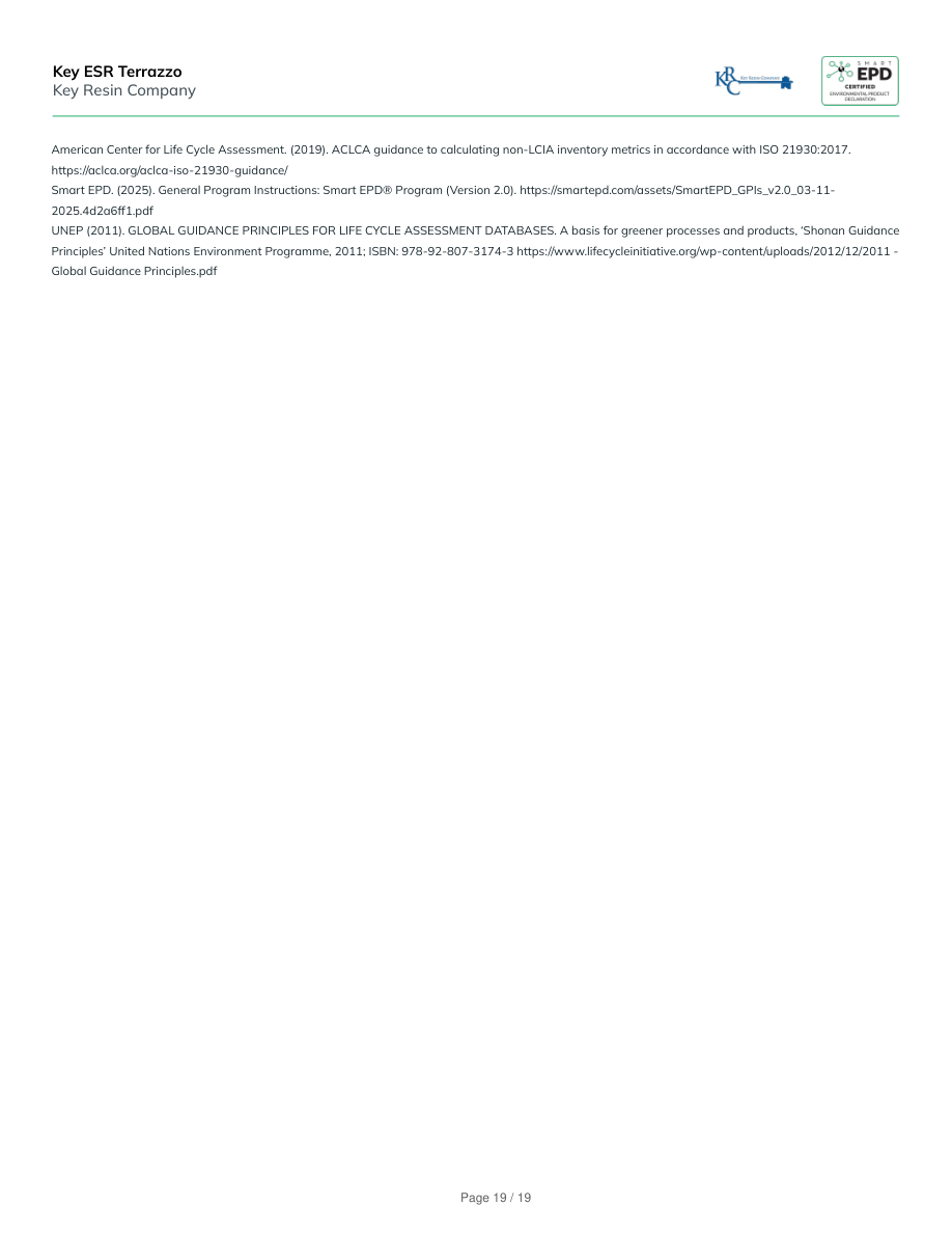 American Center for Life Cycle Assessment. (2019). ACLCA guidance to calculating non-LCIA inventory metrics in accordance with ISO 21930:2017.https://aclca.org/aclca-iso-21930-guidance/Smart EPD. (2025). General Program Instructions: Smart EPD® Program (Version 2.0). https://smartepd.com/assets/SmartEPD_GPIs_v2.0_03-11-2025.4d2a6ff1.pdfUNEP (2011). GLOBAL GUIDANCE PRINCIPLES FOR LIFE CYCLE ASSESSMENT DATABASES. A basis for greener processes and products, ‘Shonan GuidancePrinciples’ United Nations Environment Programme, 2011; ISBN: 978-92-807-3174-3 https://www.lifecycleinitiative.org/wp-content/uploads/2012/12/2011 -Global Guidance Principles.pdfKey ESR TerrazzoKey Resin CompanyPage 19 / 19