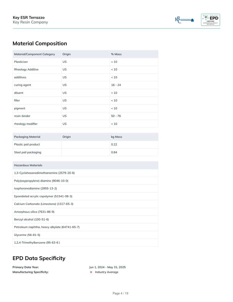 Material CompositionMaterial/Component CategoryOrigin% MassPlasticizerUS< 10Rheology AdditiveUS< 10additivesUS< 10curing agentUS16 - 24diluentUS< 10fillerUS< 10pigmentUS< 10resin-binderUS50 - 76rheology modifierUS< 10Packaging MaterialOriginkg MassPlastic pail product0.22Steel pail packaging0.84Hazardous Materials1,3-Cyclohexanedimethanamine (2579-20-6)Poly(oxypropylene) diamine (9046-10-0)Isophoronediamine (2855-13-2)Epoxidated acrylic copolymer (51541-08-3)Calcium Carbonate (Limestone) (1317-65-3)Amorphous silica (7631-86-9)Benzyl alcohol (100-51-6)Petroleum naphtha, heavy alkylate (64741-65-7)Glycerine (56-81-5)1,2,4-Trimethylbenzene (95-63-6 )EPD Data SpecificityPrimary Data Year:Jun 1, 2024 - May 31, 2025Manufacturing Specificity:Industry AverageKey ESR TerrazzoKey Resin CompanyPage 4 / 19