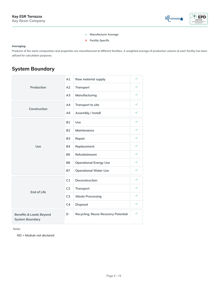 Manufacturer AverageFacility SpecificAveraging:Products of the same composition and properties are manufactured at different facilities. A weighted average of production volume at each facility has beenutilized for calculation purposes.System BoundaryProductionA1Raw material supplyA2TransportA3ManufacturingConstructionA4Transport to siteA5Assembly / InstallUseB1UseB2MaintenanceB3RepairB4ReplacementB5RefurbishmentB6Operational Energy UseB7Operational Water UseEnd of LifeC1DeconstructionC2TransportC3Waste ProcessingC4DisposalBenefits & Loads BeyondSystem BoundaryDRecycling, Reuse Recovery PotentialNote:ND = Module not declaredKey ESR TerrazzoKey Resin CompanyPage 5 / 19
