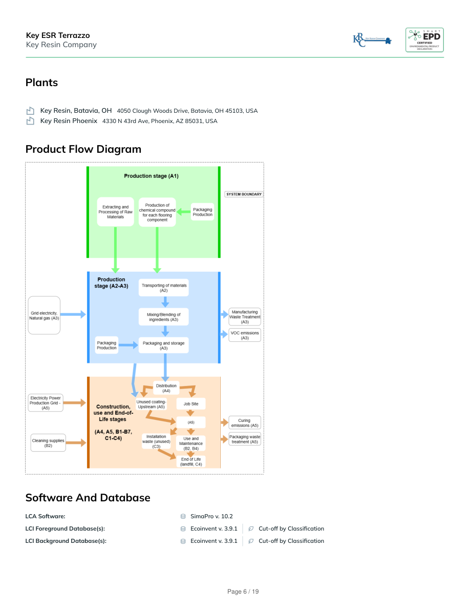 PlantsKey Resin, Batavia, OH4050 Clough Woods Drive, Batavia, OH 45103, USAKey Resin Phoenix4330 N 43rd Ave, Phoenix, AZ 85031, USAProduct Flow DiagramSoftware And DatabaseLCA Software:SimaPro v. 10.2LCI Foreground Database(s):Ecoinvent v. 3.9.1Cut-off by ClassificationLCI Background Database(s):Ecoinvent v. 3.9.1Cut-off by ClassificationKey ESR TerrazzoKey Resin CompanyPage 6 / 19